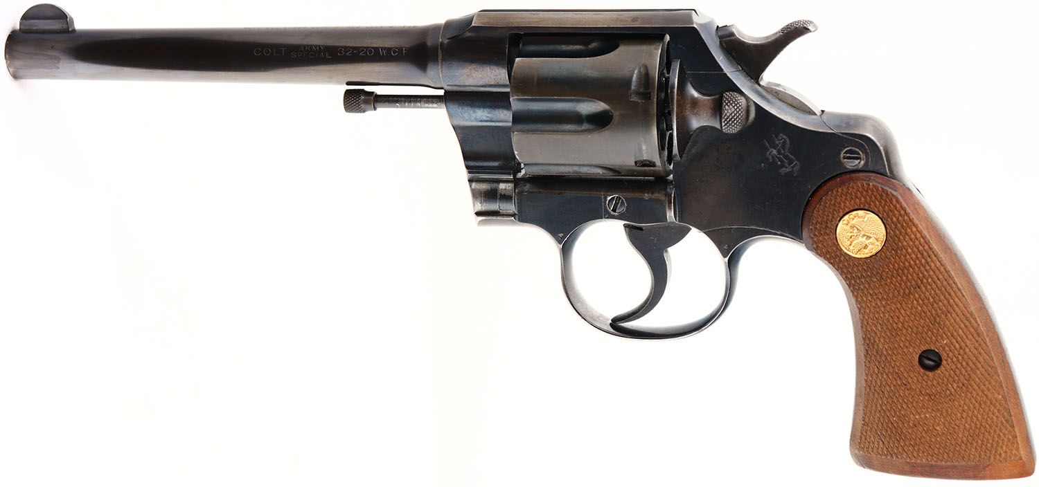 Colt, Army Special, CAL: 32-20 WCF, MFG: 1923, SN: 498178, Double Action Revolver, 6'' barrel. The replaced Colt logo medallion checkered wood grips are excellent. The reblued metal finish on the barrel rates 97%. The original metal blue finish on the frame & trigger guard rates 85% & the cylinder has mostly worn to a mix of metal gray & brown patina, with blue remaining in the fluted areas. Bore is excellent, with some frosting/haze. Integral notch rear sight & blade front sight. FFL or C&R Req. - Value: 300 to 600