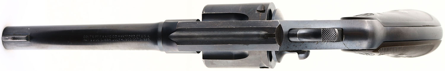 Colt, Army Special, CAL: 32-20 WCF, MFG: 1927, SN: 589611, Double Action Revolver, 5'' barrel. The Colt checkered hard rubber grips are good. The bottom front corner of the left grip has a sizeable edge chip, along with smoothed checkering on both grips. The metal blue finish rates 90% on the barrel & 95% on the frame/trigger guard. There are visible buff lines on the right side of the frame. Bore is excellent. Integral square notch rear sight & blade front sight. FFL or C&R Req. - Value: 400 to 800
