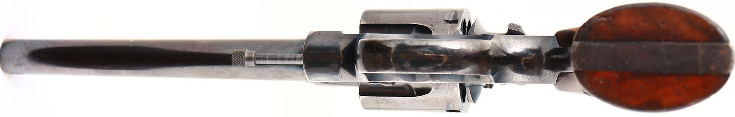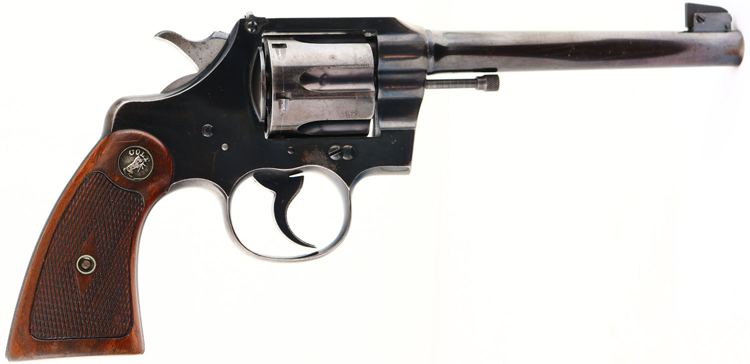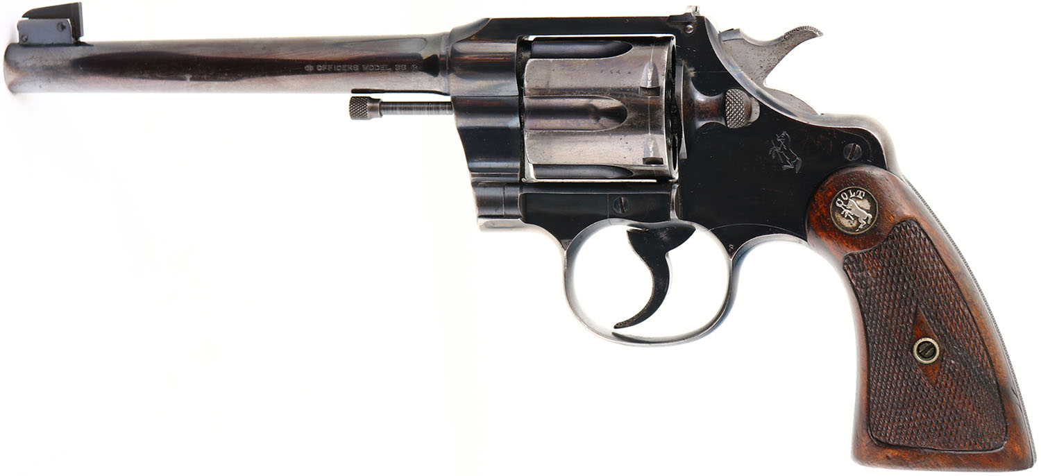 Colt, Officers Model - 2nd Issue, CAL: 38, MFG: 1915, SN: 405151, Double Action Revolver, 6'' barrel. The Colt logo medallion checkered wood grips are excellent. There is light overall wear, with contusions & scrapes. The original high-luster metal blue finish rates 75% on the barrel, with holster wear, scratches & spotting toned to a brown patina. The frame & trigger guard rates 85%, with a few small areas worn to metal gray. Bore is very good & bright, with intermittent light pitting. Adjustable rear sight & adjustable pinned blade front sight. FFL or C&R Req. - Value: 500 to 900