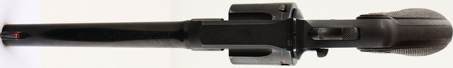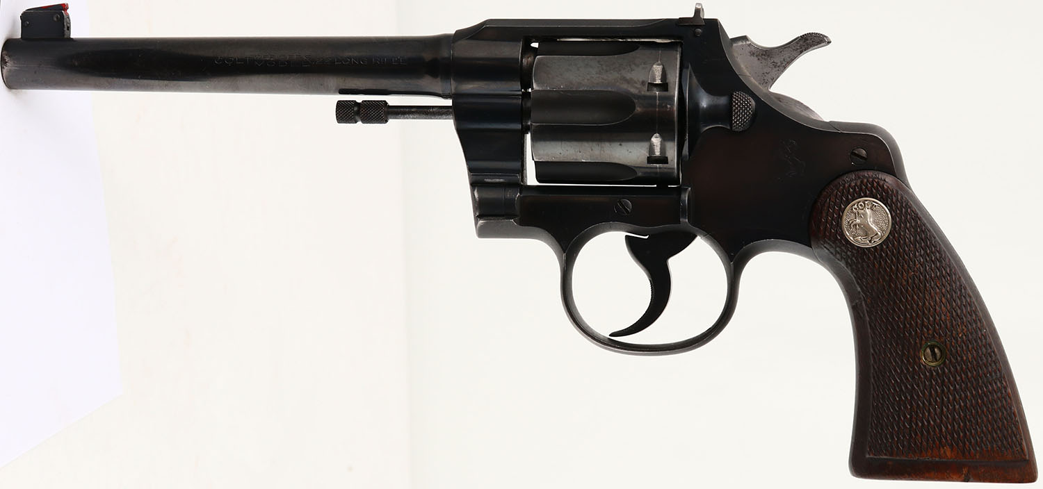 Colt, Officer's Model Target, CAL: .22LR, MFG: 1933, SN: 7677, Double Action Revolver, 6'' barrel. The Colt logo medallion checkered wood grips are very good & solid. There are nicks, dings, scrape & smoothed checkering. The original metal blue finish rates 85% on the barrel, 90% on the high-luster blue parts of the frame & the matte top/back/front strap have spotting & have toned to a brown patina. Cylinder rates 80%, with intermittent rust speckling. Bore is excellent, with consistent frosting/haze. Adjustable rear sight & adjustable pinned red blade front sight. FFL or C&R Req. - Value: 500 to 1000