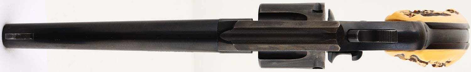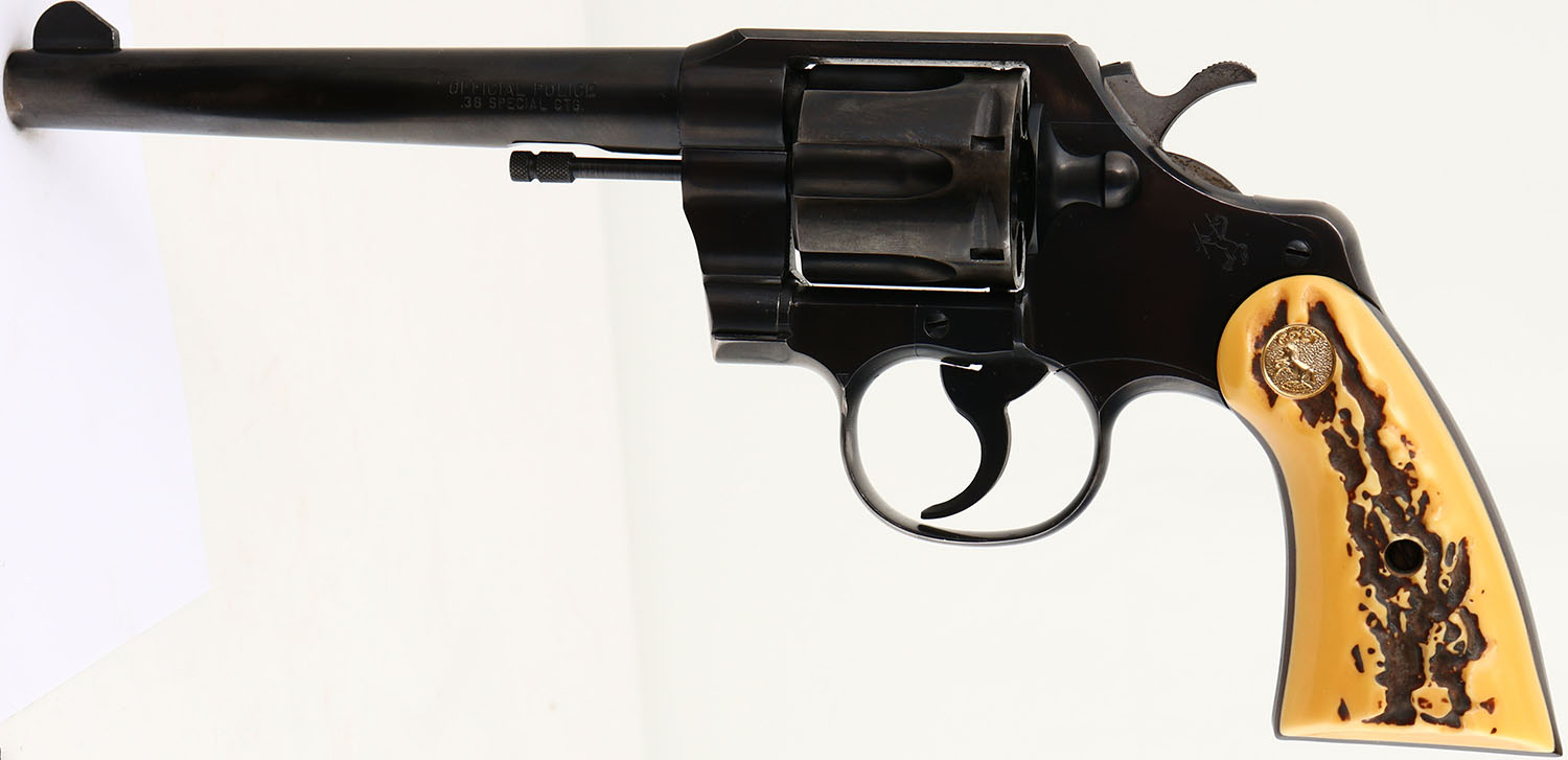 Colt, Official Police - Post-War, CAL: 38 SPL, MFG: 1958, SN: 862684, Double Action Revolver, 6'' barrel. The Colt logo medallion plastic stag grips are excellent. They have toned butterscotch. The metal blue finish rates 85% on the barrel, with holster wear/ The frame rates 85%, with concentrated loss to the back strap, top strap & trigger guard. The cylinder rates 70%, with areas worn to metal gray with a thin brown patina. Bore is excellent. Integral square notch rear sight & serrated blade front sight. FFL or C&R Req. - Value: 350 to 600