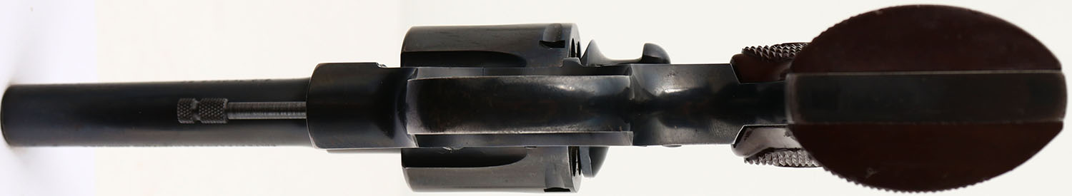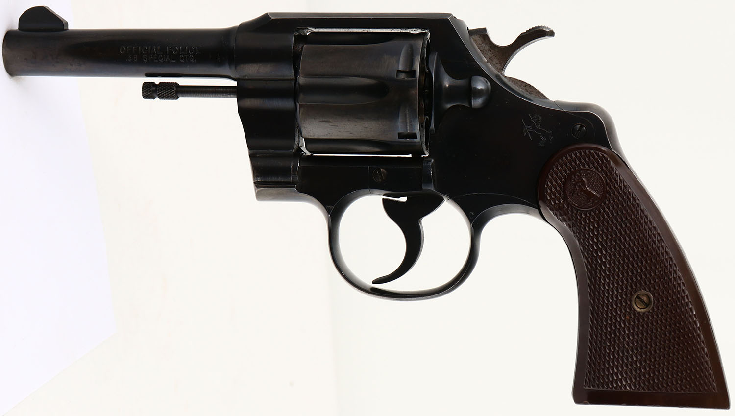 Colt, Official Police - Post-War, CAL: 38 SPL, MFG: 1960, SN: 873102, Double Action Revolver, 4'' barrel. The Colt logo medallion checkered plastic grips are excellent, with some minor dings to the bottom edge of both grips. The original metal blue finish on the barrel rates 85% with holster wear. The frame rates 85%, with minor spotting/speckling & areas worn to metal gray on the top strap/edges. The trigger guard rates 60%, with concentrated loss to the back strap. Bore is excellent. Integral square notch rear sight & serrated blade front sight. FFL or C&R Req. - Value: 350 to 600