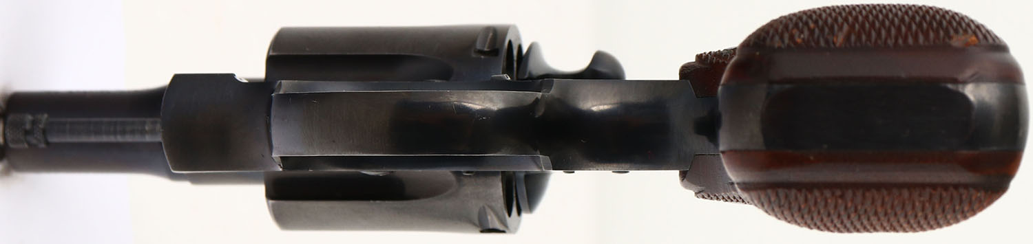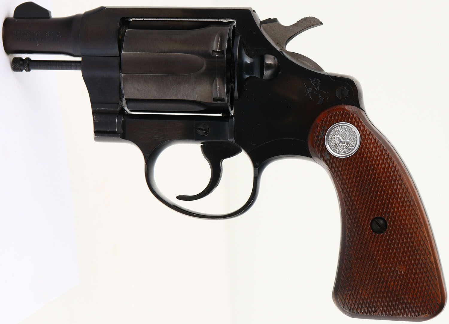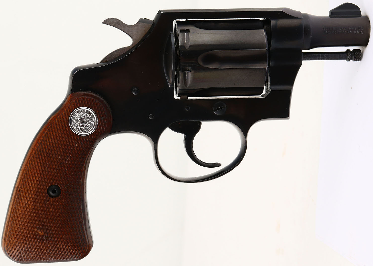 Colt, Detective Special - 2nd Issue, CAL: 38 SPL, MFG: 1956, SN: 692978, Double Action Revolver, 2'' barrel. The Colt logo medallion checkered wood grips are excellent, with only minor handling marks. The original metal blue finish rates 99% overall. Bore is excellent. Integral square notch rear sight & serrated blade front sight. A high condition example of a Post-War Detective Special. FFL or C&R Req. - Value: 800 to 1400