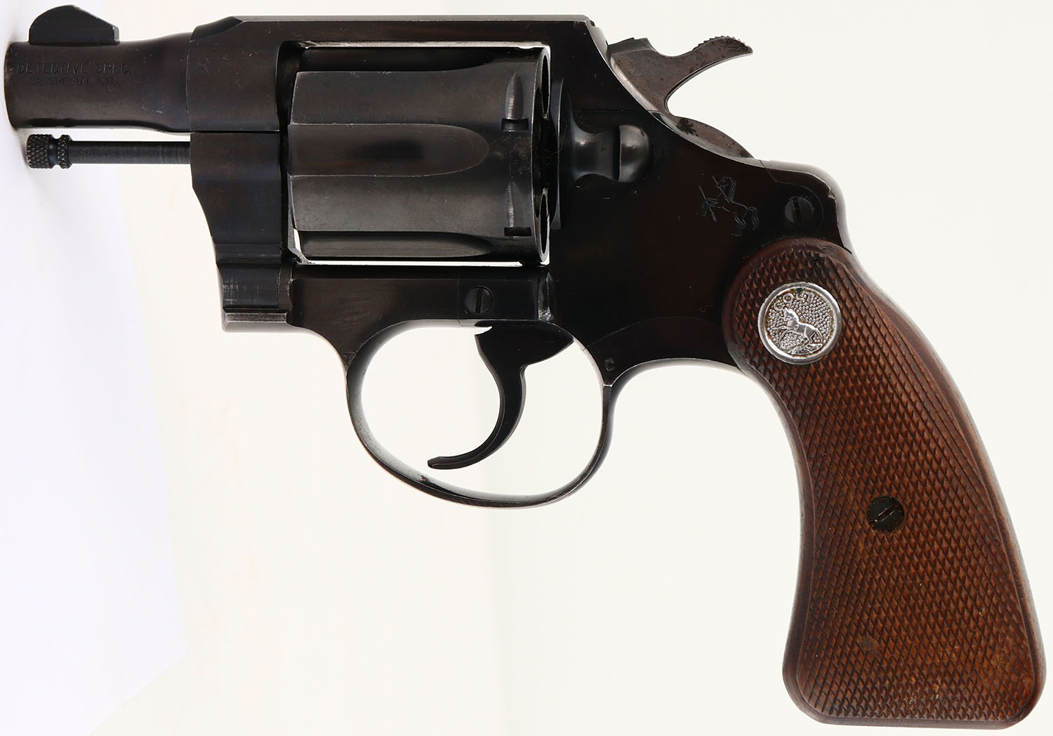 Colt, Detective Special - 2nd Issue, CAL: 38 SPL, MFG: 1959, SN: 727310, Double Action Revolver, 2'' barrel. The Colt logo medallion checkered wood grips are excellent, with minor handling marks & slightly smooth checkering. The metal blue finish on the barrel rates 90%, with wear at the muzzle & scratches on the right side of the barrel. The frame rates 85%, with edge wear, light speckling & scratches to the right side of the frame ahead of the trigger guard. The trigger guard rates appx. 70%, with concentrated wear to the backstrap & butt. The cylinder rates appx 85%, with edge/holster wear & intermittent spotting toned to a brown patina. Bore is excellent. Integral square notch rear sight & serrated blade front sight. FFL or C&R Req. - Value: 450 to 850