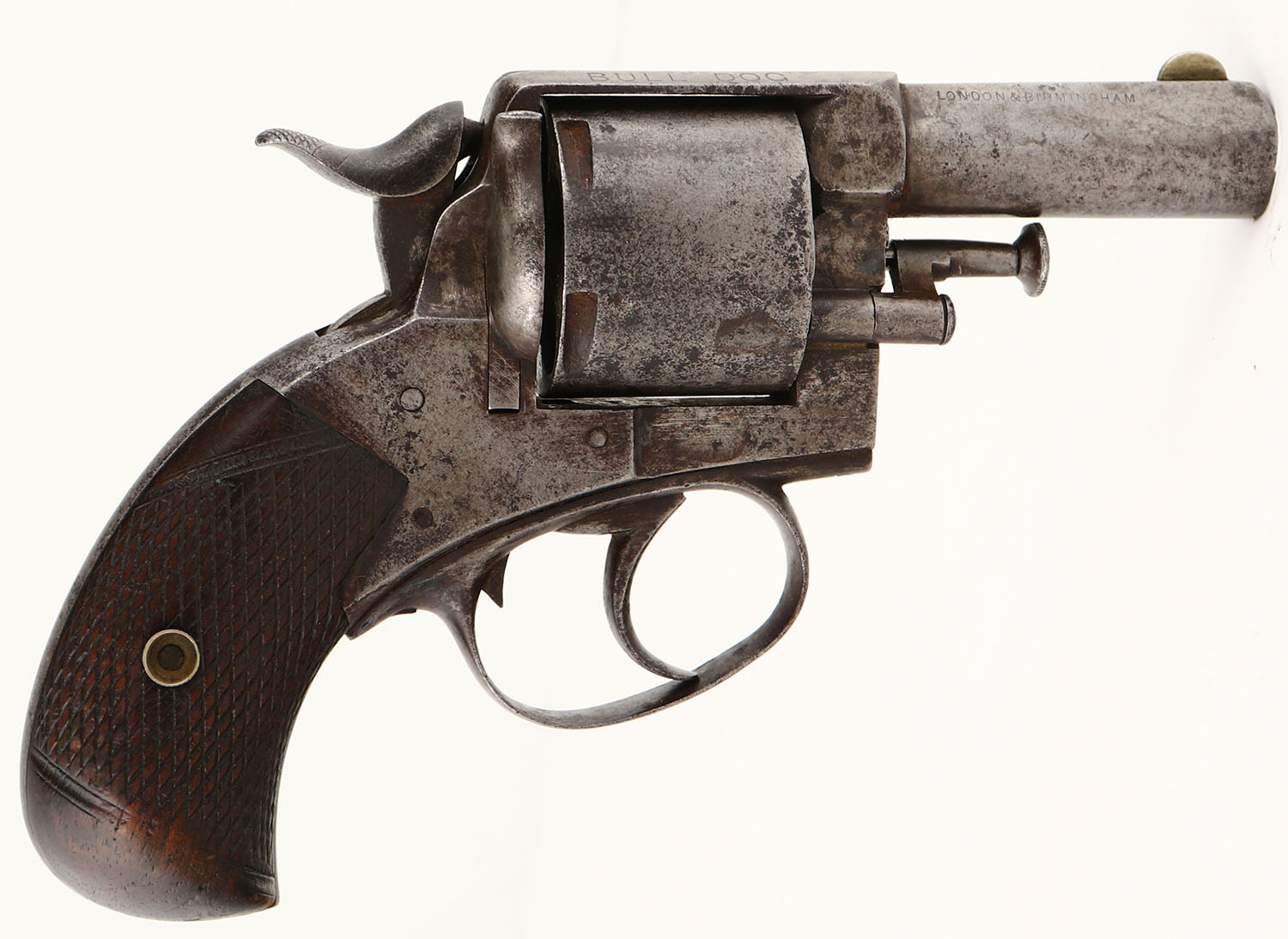 Webley & Son, The British Bulldog, CAL: marked .442 CF, MFG: circa 1880's, SN: 52713, Double Action Revolver, 2 1/2'' barrel. The top of the barrel is marked ''P.WEBLEY & SON'', the right side of the barrel is marked ''LONDON & BIRMINGHAM''. The top of the frame is marked in two lines ''THE BRITISH BULL DOG''. The left side of the frame is marked ''WEBLEY'S NO 2 442 CF'' in an oval, above the flying bullet logo & ''W&S''. The full SN can be seen below the previous markings. The checkered birds head style wood grips are very good & solid. There are minor contusions, scrapes & the checkering is beginning to smooth towards the butt. The metal finish has fully worn to a mix of metal gray & brown patina, with consistent cleaned pitting throughout. Bore is fair, consistently rough, with intermittent pitting. Integral V-notch rear sight & blade front sight. Cylinder free spins when the hammer is down, & has some play when hammer is cocked. Antique, No FFL Req. - Value: 150 to 350