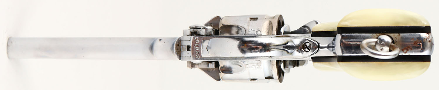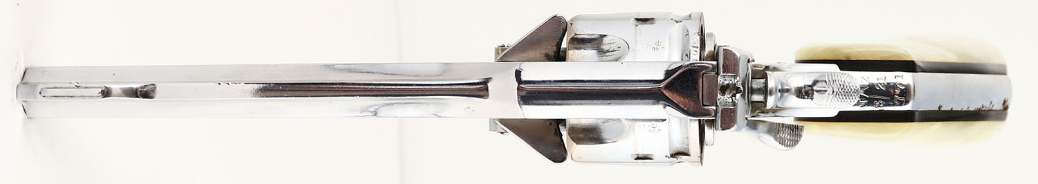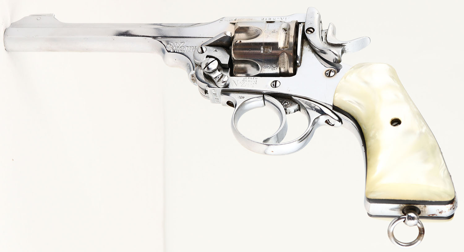 Webley, Mark VI, CAL: .455 Webley, MFG: 1915-23, SN: 380163, Double Action Revolver, 6'' barrel. The top left side of the frame is marked with (5) proof marks, ahead of ''MARK VI''. The left side of the frame below the cylinder is marked with (New Zealand Broad Arrow) ''N^Z'' ''WEBLEY MARK VI PATENT 1918'' ahead of (2) proof marks that are not legible. Ahead of the cylinder on the barrel is marked ''PROOF .455 700/060? 6 TONS PER''. The top of the back strap is marked ''N^Z'' over ''3/21'' over ''771''. There are multiple broad arrow proof marks throughout the revolver. The SN can be seen on the rear of the cylinder, trigger guard & front side of the barrel above the tip-up swivel. The faux pearl grips are excellent. The nickel finish is excellent overall, with only a small area of flaking on the backstrap. There are numerous thin brush lines & a couple areas of haze ahead of the cylinder. Bore is excellent, with intermittent frost/haze. Integral U-notch rear sight & elevated pinned blade front sight. Lanyard loop present. The cylinder locks up when the hammer is down & has a small amount of play. There is also a small amount of play in the cylinder when the hammer is cocked. FFL or C&R Req. - Value: 1000 to 2000