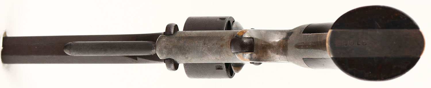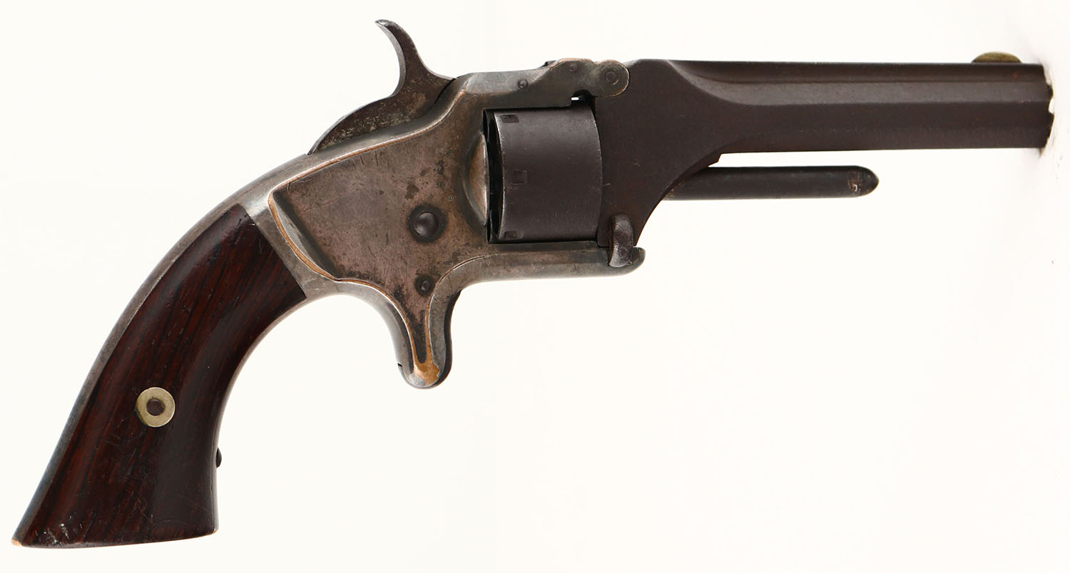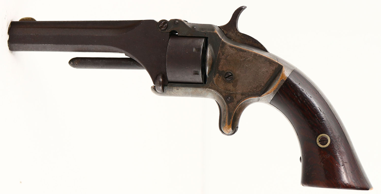 Smith & Wesson, 1st Model - 2nd Issue, CAL: .22 SHORT, MFG: 1860-68, SN: 31075, Single Action Tip-Up Revolver, 3 1/4'' barrel. The two-piece wood grips are excellent, with scrapes, & minor nicks/dings. The finish is beginning to thin towards the bottom of the left grip. The metal blue finish on the barrel & cylinder has fully toned to a brown patina. The silver plated frame is a mix of faded silver, gray/brown patina & areas worn to reveal the brass frame. Bore is fair & dark, with pitting. Appx. 115,000 2nd Issue 1st Models were produced. Antique, No FFL Req. - Value: 200 to 400