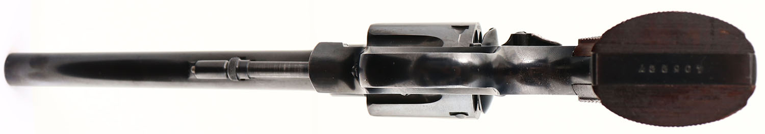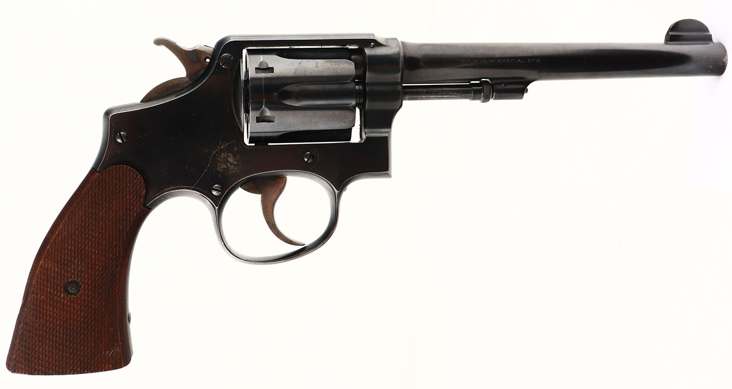 Smith & Wesson, .38 M&P Model of 1905 - 4th Change, CAL: .38 S&W SPL, MFG: 1915-42, SN: 405227, Double Action Revolver, 6'' barrel. The replaced checkered wood grips are excellent. The original metal blue finish rates 95% overall, with concentrated loss at the muzzle & right side of frame. The case-hardened trigger & hammer retain faded, but visible case-colors. Bore is excellent. Small integral notch rear sight & blade front sight. FFL or C&R Req. - Value: 600 to 1100