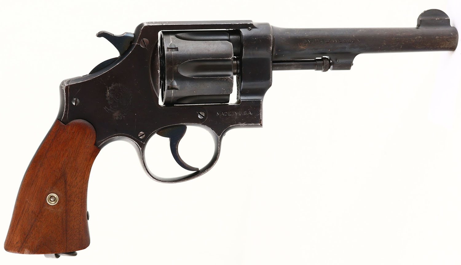 Smith & Wesson, Model 1917 Brazilian Contract (1st Contract), CAL: 45 ACP, MFG: 1937, SN: 185615, Double Action Revolver, 5 1/2'' barrel. The top of the barrel has standard address & patent dates. Standard markings on the barrel & frame. The right side of the frame carries the Brazilian crest & bears the date ''1937''. The original smooth walnut grips are excellent. There are a couple dings & light scrapes. The metal blue finish rates 80% on the barrel & 85% on the frame. There are thinned areas toning to a brown patina with concentrated loss on the back strap & muzzle. Bore is good & bright, with consistent roughness/spotting throughout. Notch & blade sights. 25,000 Model 1917's were made for the Brazilian Government. This example was apart of the first shipment in 1938, which was a majority of all the pistols sent. Lanyard loop present. FFL or C&R Req. - Value: 350 to 550