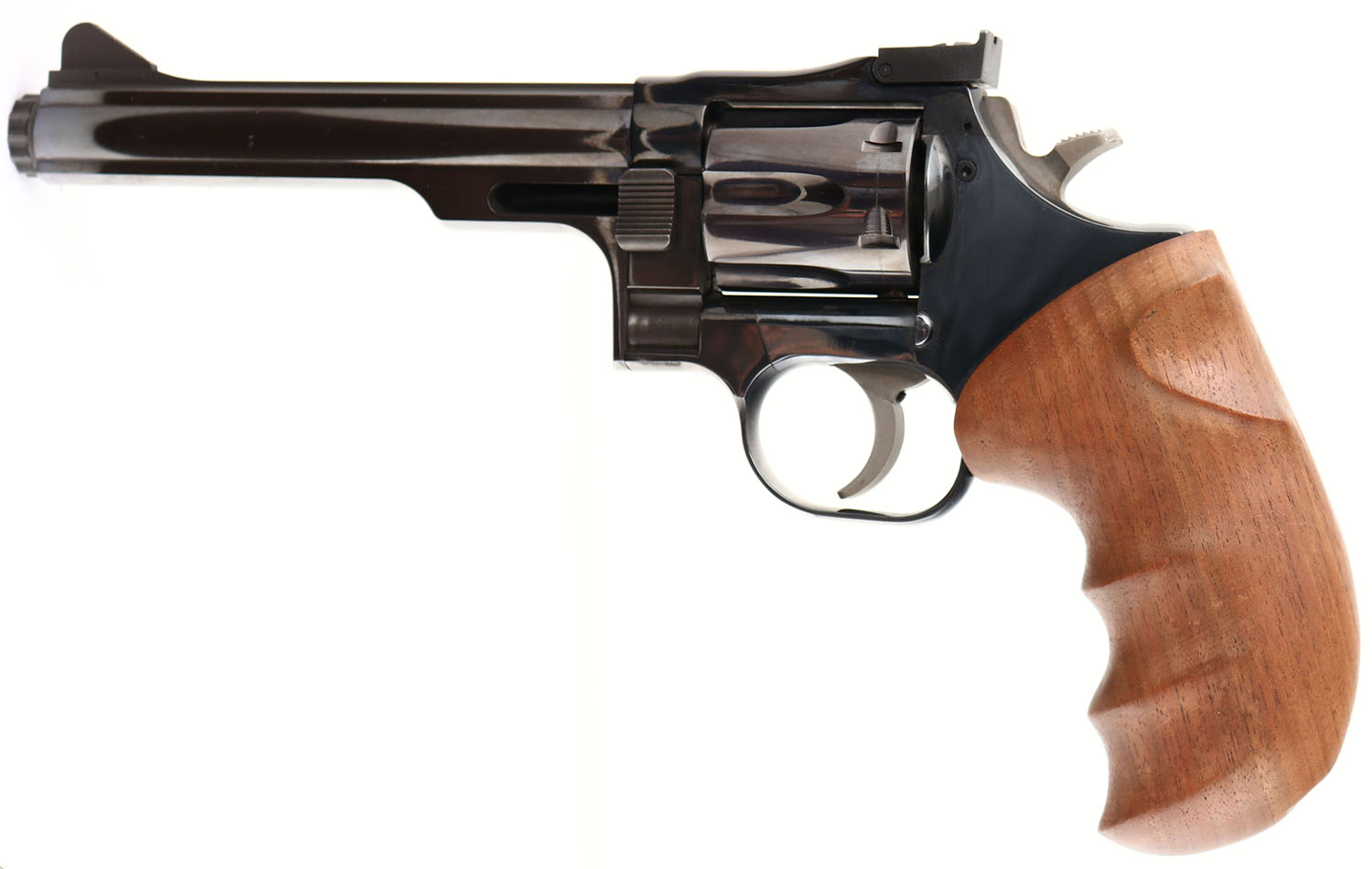 CASED, Dan Wesson Arms, Model W12 - 4 Barrel Set, CAL: 357 MAG, MFG: Modern, SN: 511, Double Action Revolver, 6'' barrel. The smooth target style grips are mint. The metal blue finish rates 99% on the barrel, toned to a chocolate patina. 97% coverage on the frame, with areas thinning & appearing hazy. The cylinder has toned to a plum patina. Bore is excellent. Adjustable rear sight & serrated blade front sight. This is a full set that includes related paperwork, (3) extra barrels (2) 4'' & (1) 2 1/2'', tool & an extra set of grips. All extra parts are excellent, in original wrapping paper. Comes in factory brown hard case, with green foam interior. Foam interior has cut outs for all extra parts. A high condition full set. FFL Req. - Value: 800 to 1600