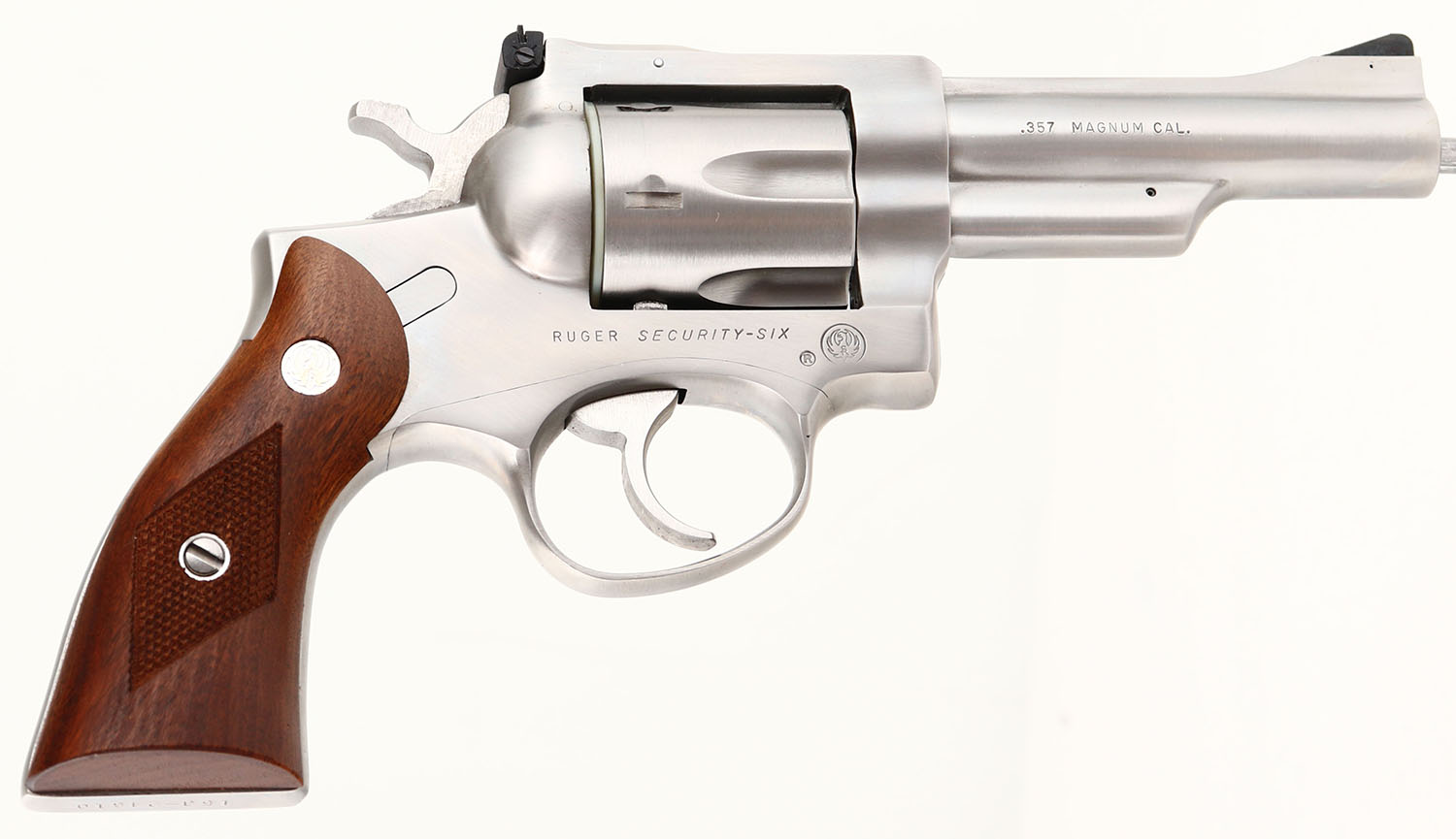 NEW BOXED, Ruger, Security-Six, CAL 357 MAG, MFG: 1977, SN: 153-24610, Double Action Revolver, 4'' barrel. The Ruger logo medallion checkered woos grips are mint. The stainless steel finish is excellent overall. Bore is mint. Adjustable rear sight & elevated serrated blade front sight. Comes in factory box, with related paperwork, original packaging & factory cardboard sleeve with end label. FFL Req. - Value: 500 to 650