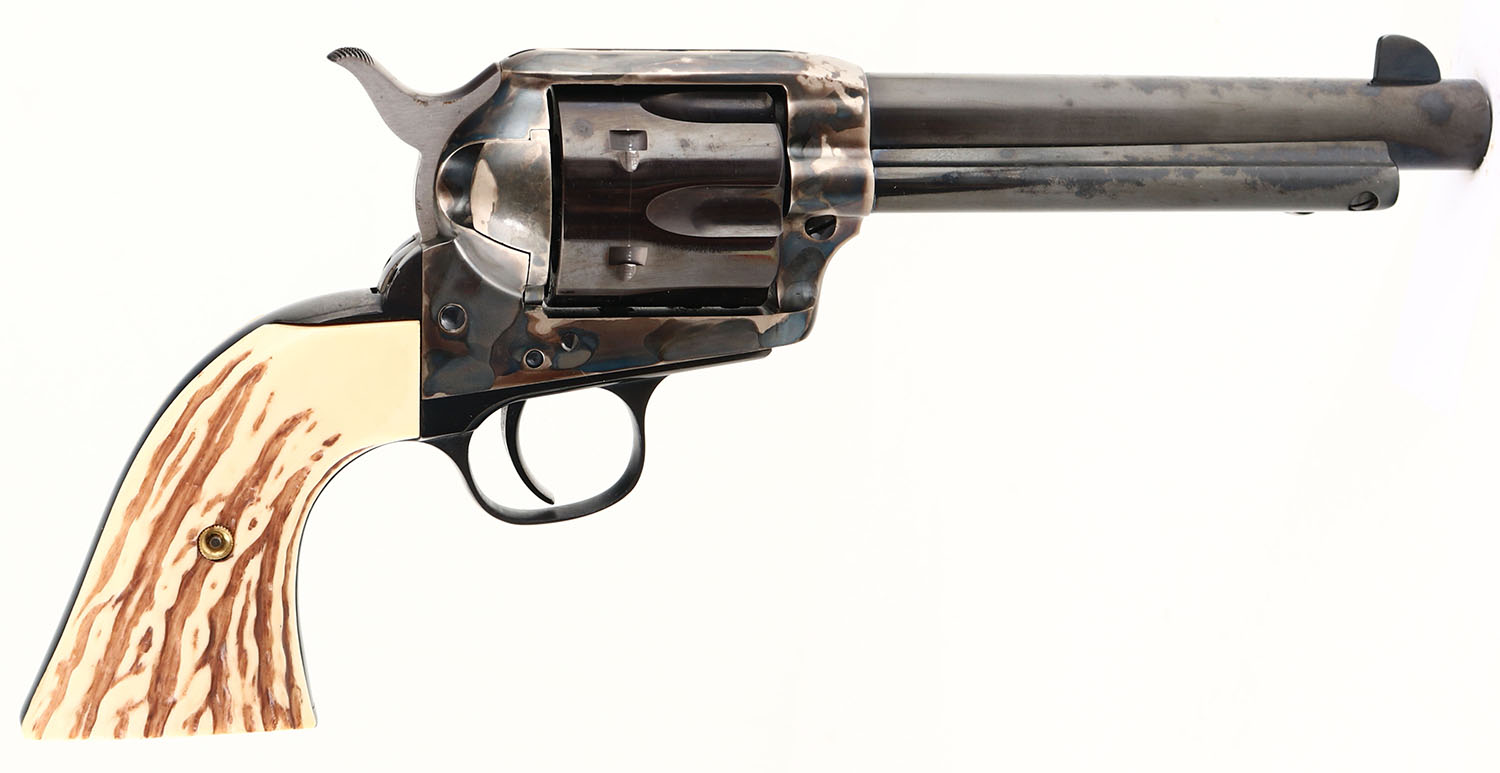 Beretta, Stampede, CAL: 45LC, MFG: Modern, SN: B03621, Single Action Revolver, 5 1/2'' barrel. The faux Stag horn grips are excellent. The metal blue finish on the barrel rates 90%, with consistent spotting on the right side of the barrel & ejector housing. The cylinder is beginning to tone plum. The case-hardened frame retains vivid case-colors. Bore is excellent. Square notch rear sight & blade front sight. FFL Req. - Value: 350 to 550