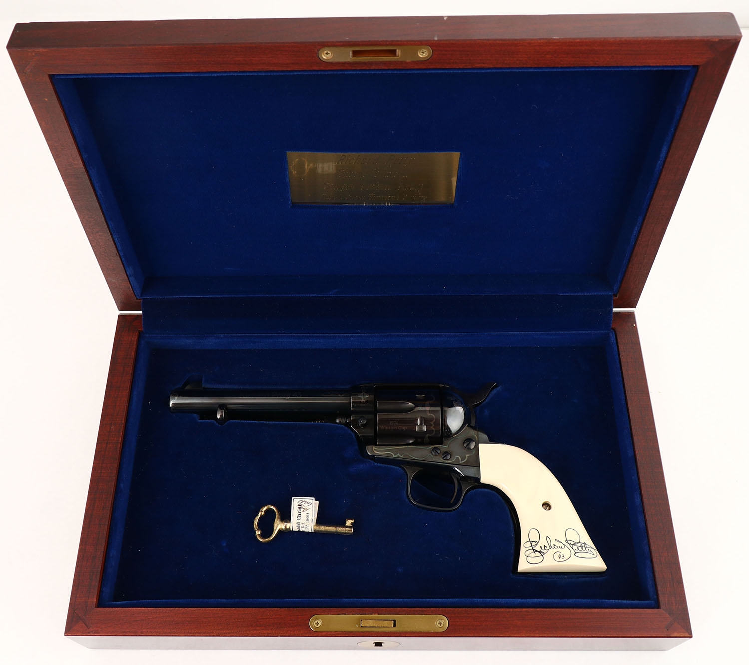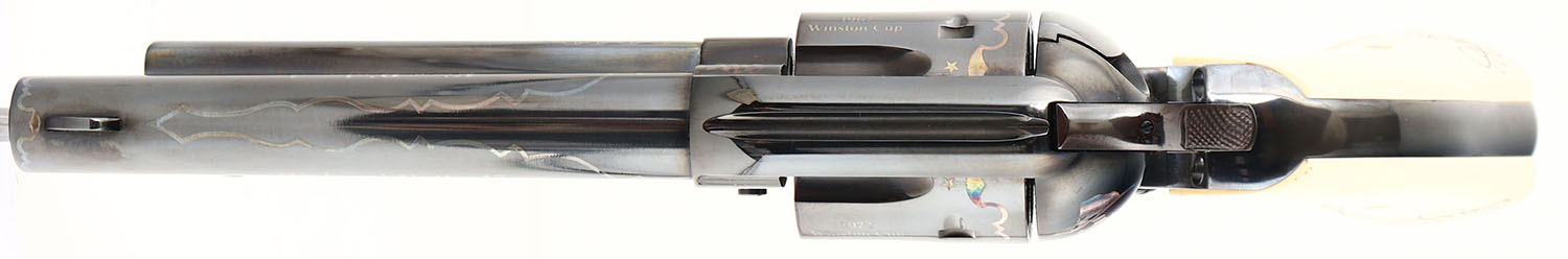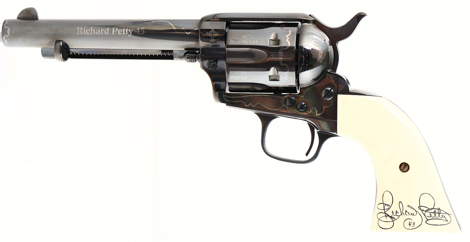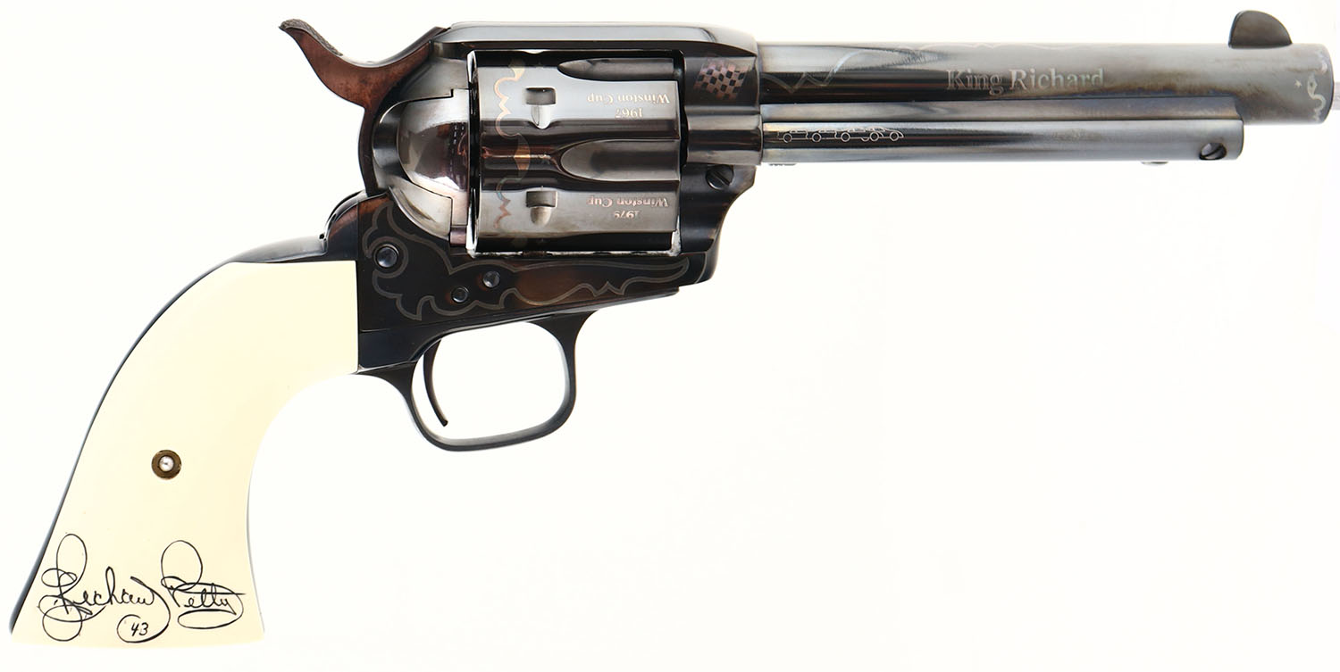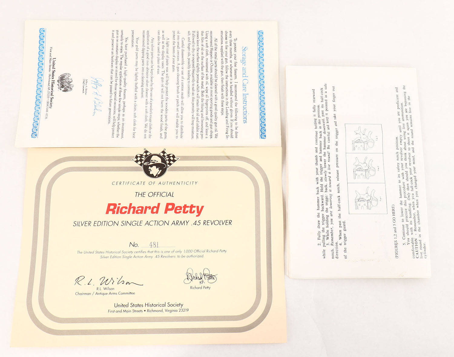 CASED, United States Historical Society (Uberti Mfg), Richard Petty Silver Edition S.A.A. #481 of 1000, CAL: 45, MFG: Modern, SN: SA578, Single Action Revolver, 5 1/2'' barrel. Standard caliber & address stamp on the bottom of the barrel. The left side of the barrel is marked ''RICHARD PETTY 43'', the right side of the barrel is marked ''KING RICHARD''. The ejector rod housing displays race cars. The left side of the frame is marked ''1964 WINSTON CUP''. The right side of the frame is marked with a checkered flag. The cylinder has a list of Winston Cup win dates & the left cylinder shoulder has a image of Richard Petty. All markings are accompanied by simple decorative line/star pattern. The grips have R.P signature. The faux ivory grips are mint. The high gloss blued finish rates 100% overall. Bore is mint. V-notch rear sight & blade front sight. Comes in factory display case, with blue interior & plaque. Included is related paperwork, certificate & case key. Only 1000 produced. FFL Req. - Value: 800 to 1500
