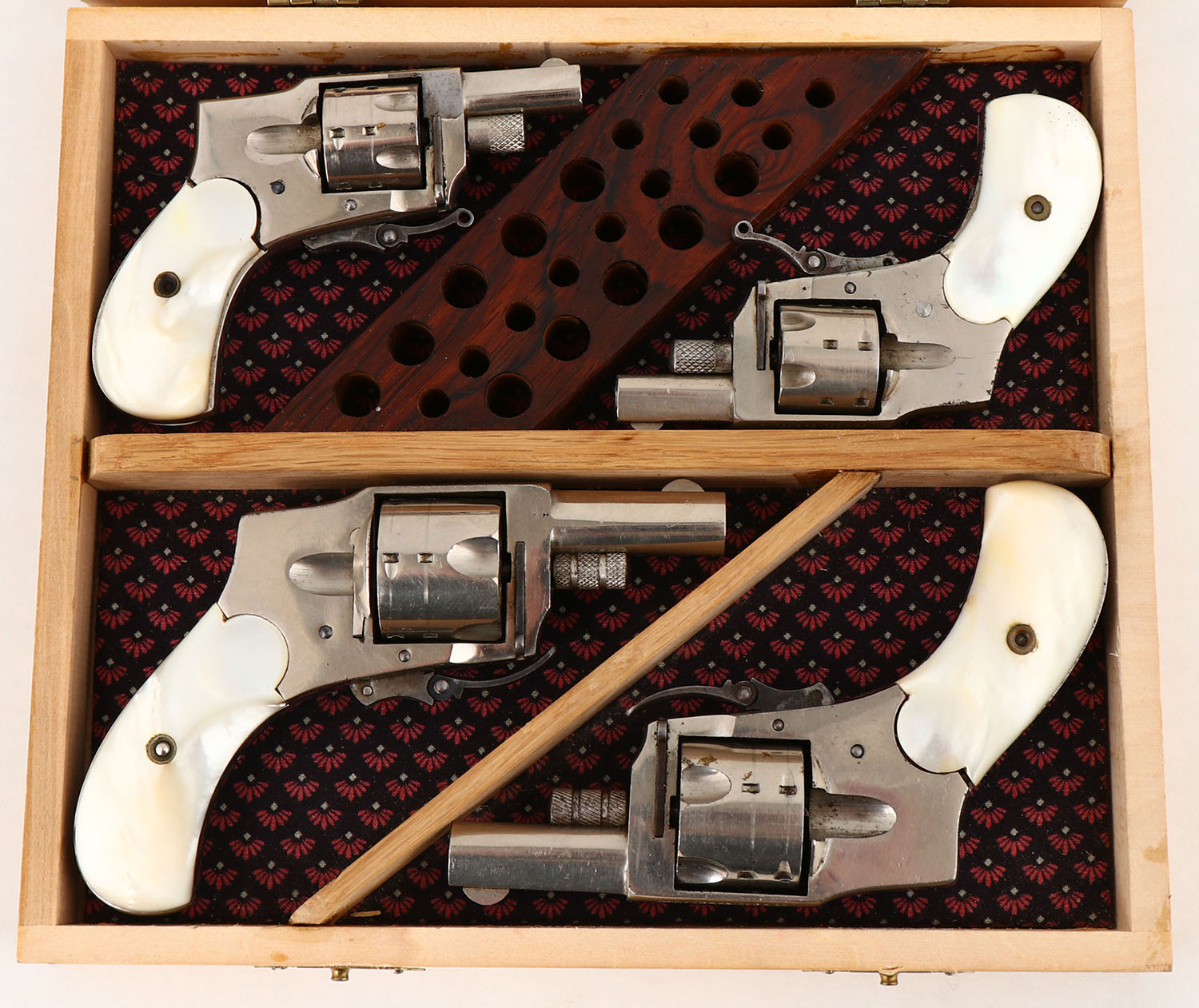 4) Kolb, Baby Hammerless New Model, CAL: 22 SHORT, MFG: circa 1910-30, SN: 434, Double Action Revolver, 1 1/4'' barrel. The Mother of Pearl grips are excellent, but the fit isn't great. The nickel finish rates 98% overall, with minor spotting/flaking toned to a brown patina. Bore is very good, with intermittent light pitting. Blade front sight. Folding trigger. This set comes in a custom presentation case, with internal cartridge holder. An excellent & unique set of Kolb pistols. FFL or C&R Req. - Value: 1000 to 1800
