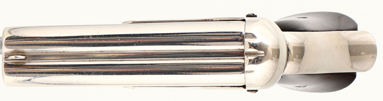 EXCELLENT, E. Remington & Sons, Elliot's 4-Shot Ring Trigger Derringer, CAL: 32 RF, MFG: 1863-88, SN: 15157, 3 3/8'' barrel. The left side of the barrel cluster is marked ''MANUFACTURED BY E. REMINGTON & SONS ILION, N.Y.'' & the right side is marked ''ELLIOTS' PATENTS MAY 29, 1860-OCT 1, 1861''. The last number one is barely legible. The frame is marked ''B'' above the left grip. The walnut grips are excellent, with minor handling marks & thinning finish. The original nickel finish rates 90% overall, with consistent spotting throughout & some areas of spotting toned to a thin brown patina. All bores are fair. They are dark & rough, with intermittent pitting. Integral notch rear sight & blade front sight. These small hideout pistols gained favor with gamblers, wealthy gentleman & lawmen. Total production estimated to be 17,500. An impressive testament to 19th century Remington quality, as it left the factory appx 150 years ago. Antique, No FFL Req. - Value: 1500 to 3000