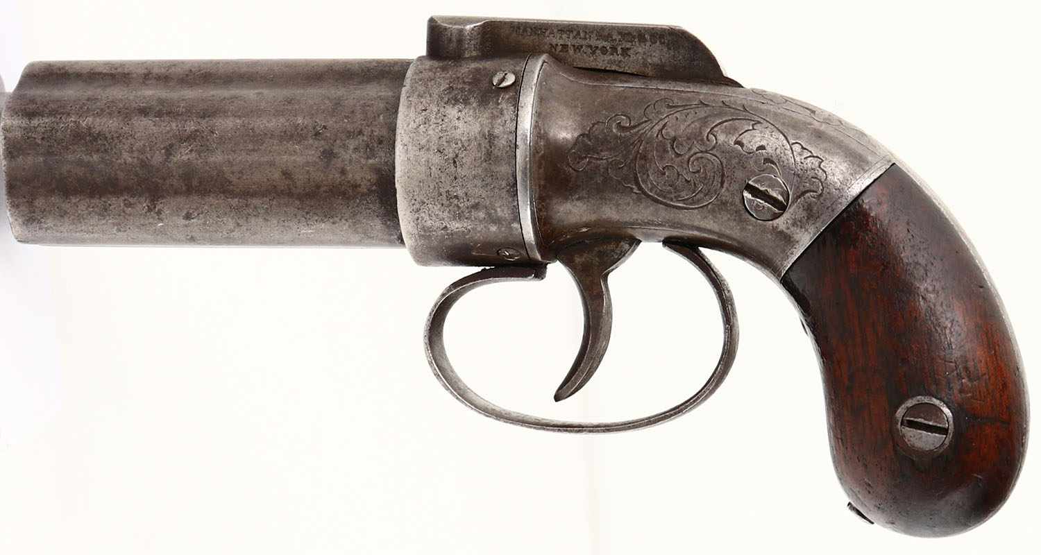 Manhattan Firearms Mfg. Co., 5-Shot Pepperbox, CAL: .28, MFG: circa 1850's, SN: 325, Double Action Percussion Pistol, 2 3/4'' barrel cluster. The left side of the hammer is marked ''MANHATTAN F.A. MFG CO NEW YORK''. Between two nipples is marked ''325'' with the ''3'' being worn smooth. The SN can also be found under the left grip panel. The wood grips are very good & solid. There are contusions, scrapes, dings& the wood has darkened from oils added over time. The frame displays simple decorative floral leaf engraving. The metal surfaces have an evenly worn to metal gray & toned to a brown patina. Bores are all good, fairly smooth, but appear grainy, with light pitting in some spots. No sights. The barrel cluster rotates when the trigger is pulled. All nipples in tact. The Manhattan Firearms Manufacturing Company was founded by a group of businessmen in 1856, anticipating the expiration of many Colt revolver patents in 1857. As the Colt patents had not expired when Manhattan Firearms began production, they first made other firearms based on expired patents, mainly single shot pistols & percussion pepperbox revolvers. Antique, No FFL Req. - Value: 500 to 1000