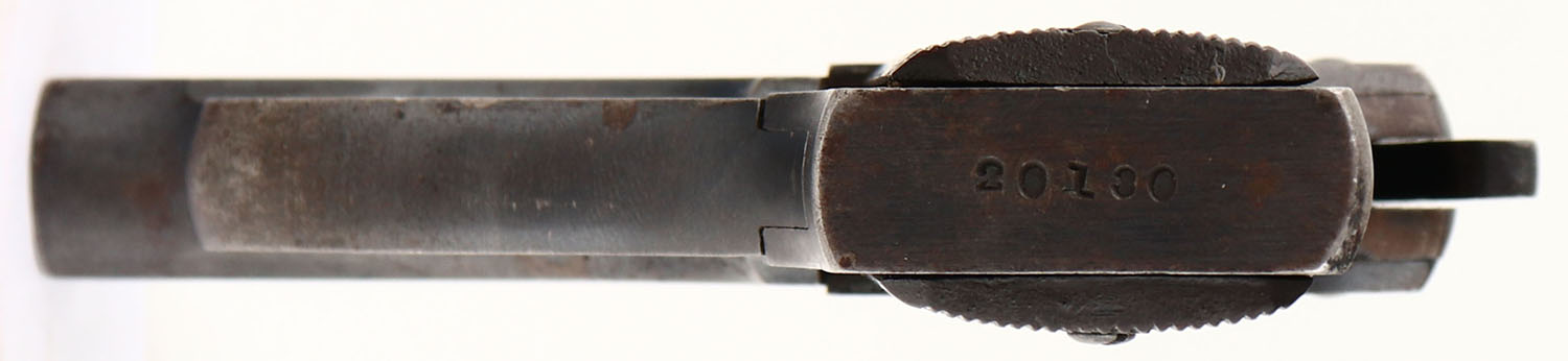 O.F Mossberg & Sons, Brownie, CAL: .22 LR, MFG: 1920-32, SN: 20180, 4-Barrel Pepperbox Pistol, 2 1/2'' barrel. The grooved wood grips are excellent. There are minor handling marks. The metal blue finish rates 40% overall, with areas toned to a brown patina & worn to metal gray. Bores are good, with intermittent roughness & pitting. Blade front sight. Mossberg provided a piece of bent sheet metal to extract the spent cartridges. That piece is present. This pistol was produced as double action, with a counter-clockwise rotating firing pin. The firing pin rotates to all four positions. This was Mossberg's first production pistol, selling just over 30,000. FFL or C&R Req. - Value: 200 to 600