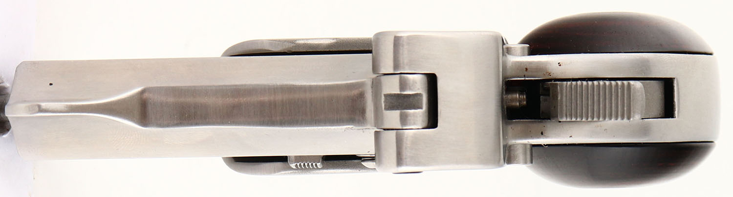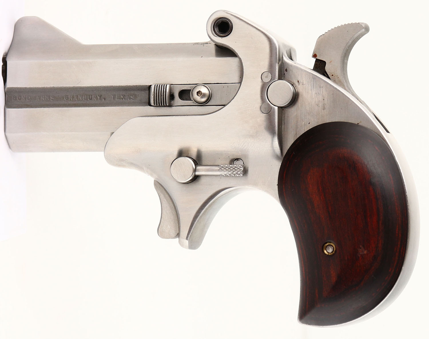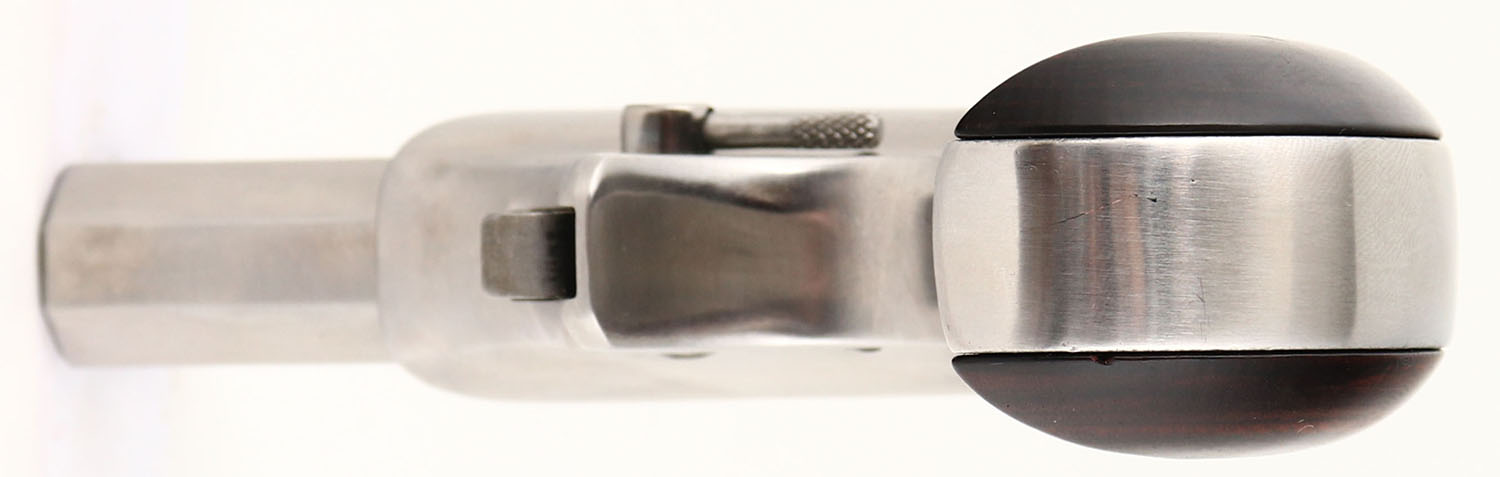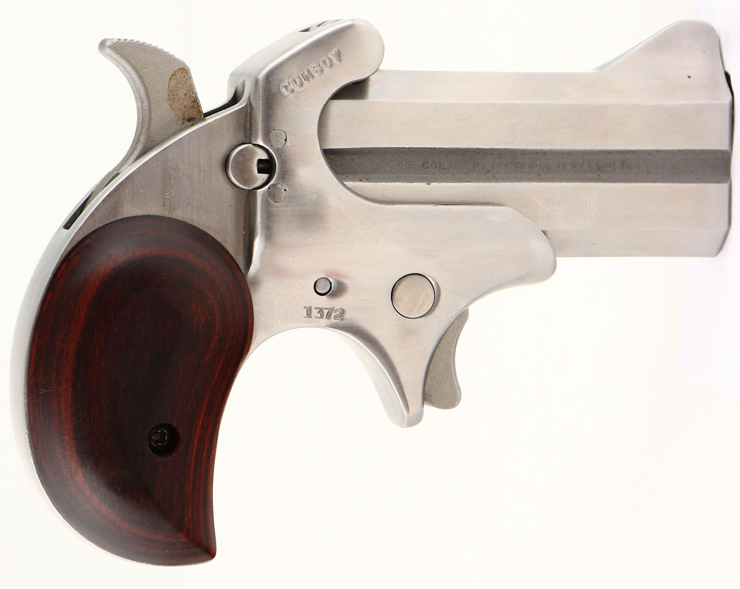 Bond Arms, Cowboy Defender, CAL: 45 Colt/.410, MFG: Modern, SN: 1372, O/U Derringer Pistol, 3'' barrel. The wood grips are excellent. The stainless steel finish is excellent, with minor wear marks. Bores are both excellent. Top barrel is rifling, bottom barrel is smooth bore. Notch rear sight & blade front sight. FFL Req. - Value: 350 to 500