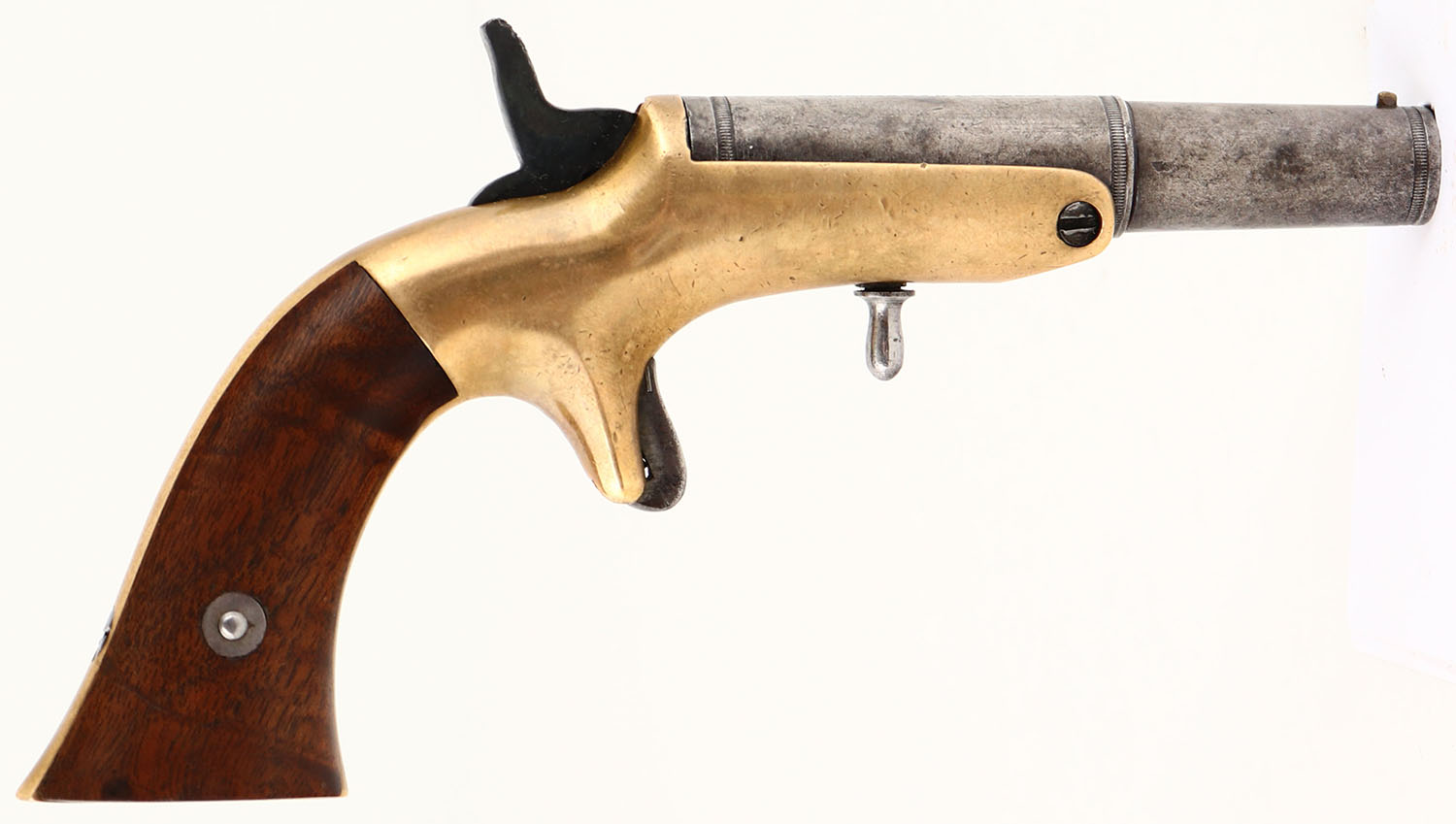 RARE, Wesson & Harrington, Derringer Pistol, CAL: 22RF, MFG: circa 1859, SN: 37, Single Shot Tip-Up Pistol, 3'' step down barrel. This is a very rare little pistol, made during the approximate six-month business relationship between Frank Wesson & Nathan Harrington. It is to be said that appx. 100 were produced in that short span. The top of the barrel is marked in three lines ''WESSON & HARRINGTON'', ''WORCESTER MASS.'', ''PATENT APPLIED FOR'', which is different than later examples with the 1859 patent date. The two-piece wood grips are excellent, with minor scrapes & handling marks. The metal blue finish on the barrel has worn to a mix of metal gray & brown patina. The brass frame has an attractive aged patina, with minor blemishes. Bore is good & bright with intermittent pitting. Small brass bead front sight. A nice example of a desirable antique American pistol. Antique, No FFL Req. - Value: 1000 to 4000