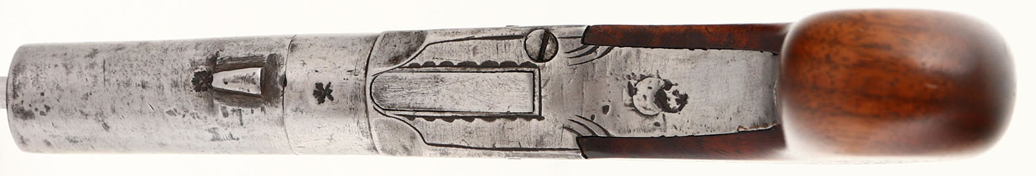 Durs Egg, Pocket Pistol, CAL: 45, MFG: Mid 1800's, SN: NONE, Percussion Single Shot Pistol, 1 1/2'' screw-on barrel. The left side of the frame is marked ''D.EGG'' & the right side is marked ''LONDON''. Proof marks on the bottom of the barrel & frame. The markings are accompanied by simple decorative engraving. The wood grips are excellent, having been lightly sanded & refinished. The metal is left ''in the white'', with areas of spotting & pitting toned to a brown patina. Bore is very good, with intermittent light pitting. No sights. Comes in a black leatherette case, with ramrod & percussions caps. Trigger folds down from inside the frame when the hammer is cocked. It can manually be folded back up into the frame. From further research, D.Egg manufactured guns from appx. 1775-1837. Antique, No FFL Req - Value: 300 to 600