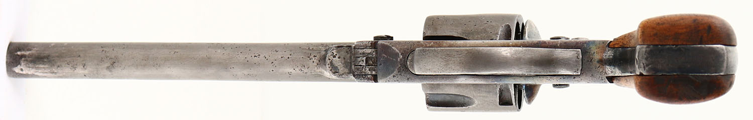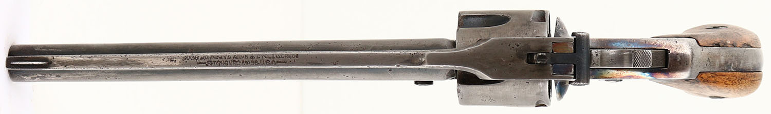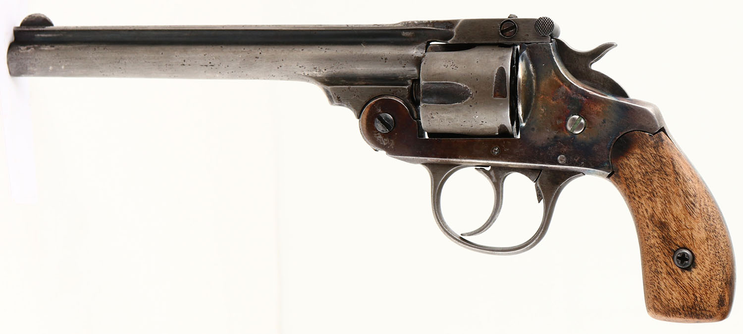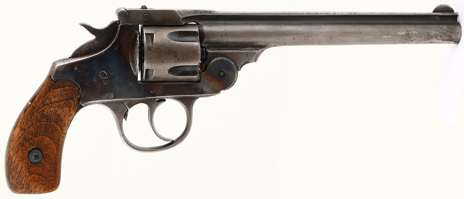 Iver Johnson, Top Break Revolver, CAL: 38, MFG: N/A, SN: None, Double Action Revolver, 6'' barrel. The smooth wood grips are very good & solid having been sanded. There are dings & scrapes, with no finish re-applied. The metal blue finish has almost fully toned to metal gray, with remnants remaining in heavily protected areas. There appears to have been heat exposure to the frame, resulting in some case-color like tones, with cleaned pitting throughout. Bore is poor, with heavy pitting throughout. Notch rear sight & blade front sight. Multiple issues with mechanical operation. Needs to be inspected by a licensed gunsmith before operation. SOLD AS IS- NO RETURNS. FFL or C&R Req. - Value: 40 to 80