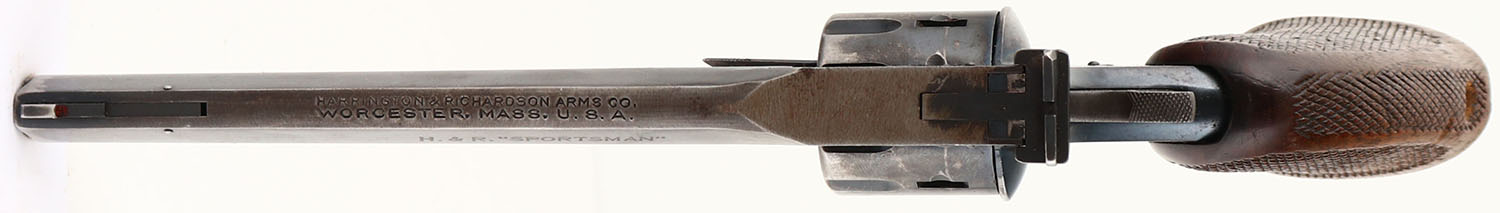 Harrington & Richardson, H&R Sportsman 999, CAL: 22LR, MFG: 1943, SN: D20320, 9 Shot Double Action Revolver, 6'' barrel. The checkered wood grips are very good & solid. There is even overall wear, smooth checkering & the bottom of the grips have ''MRE'' scratched into them. The metal blue finish on the barrel rates 50% & the frame rates 85%, with concentrated loss to the front strap. Bore is excellent, with visible light wear. Adjustable rear sight & blade front sight. FFL or C&R Req. - Value: 200 to 400