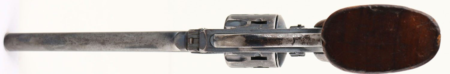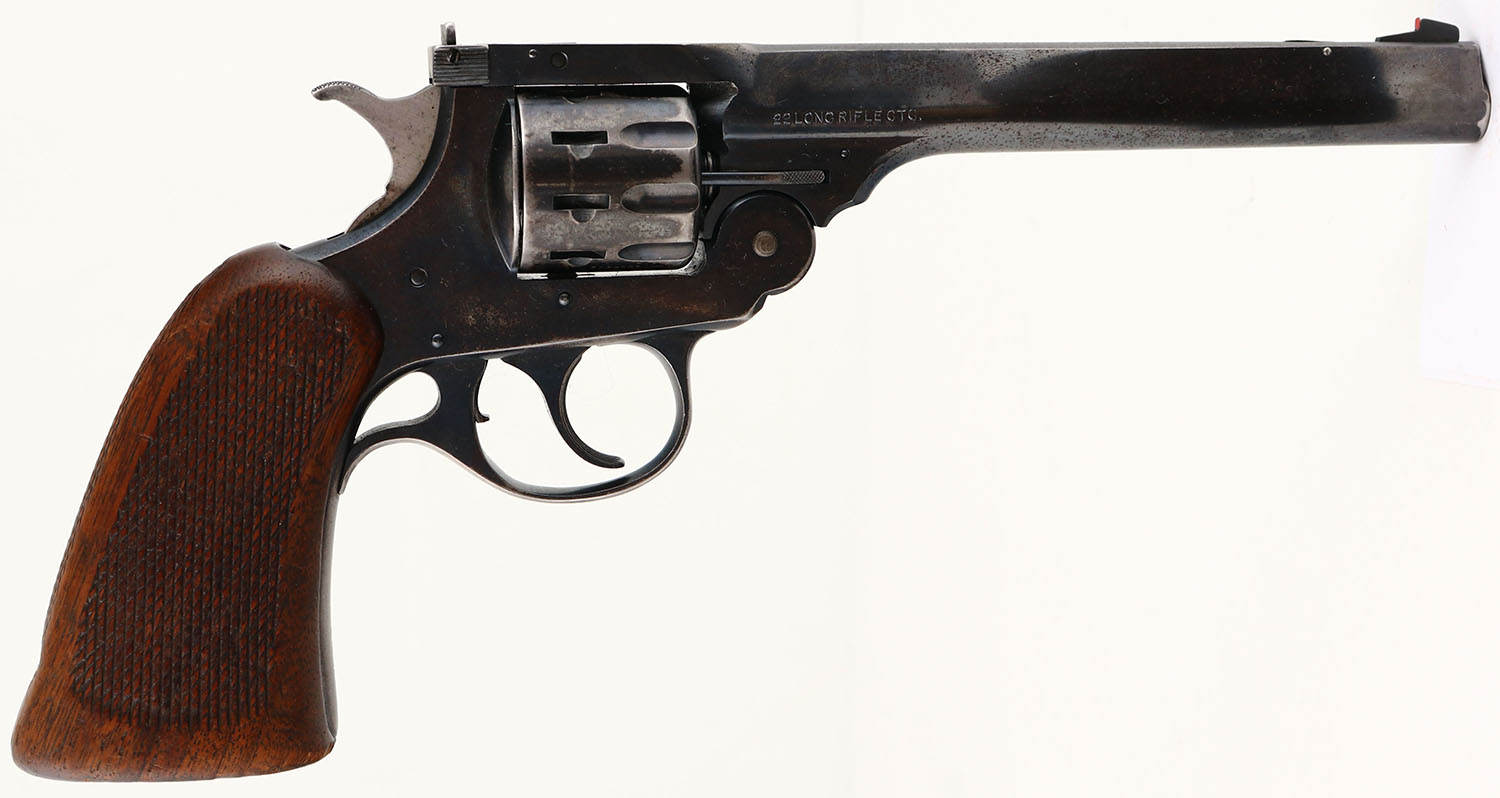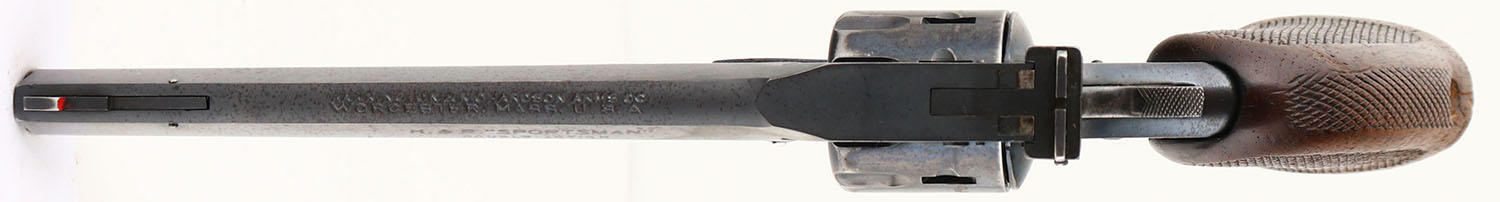 Harrington & Richardson, H&R Sportsman 999, CAL: 22LR, MFG: 1943, SN: D25137, 9 Shot Double Action Revolver, 6'' barrel. The checkered wood grips are very good & solid. There are dings, nicks & scrapes throughout. The metal blue finish on the barrel rates 80%, with consistent rust speckling & the frame rates 60%, with loss on the front strap & consistent rust speckling throughout. Bore is excellent. Adjustable rear sight & blade front sight. FFL or C&R Req. - Value: 200 to 400