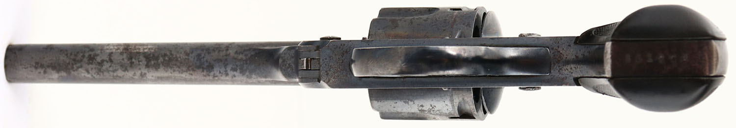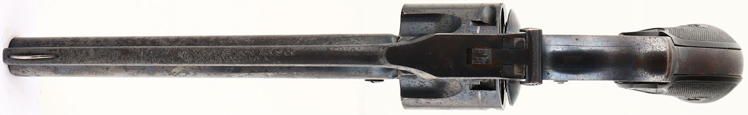 Harrington & Richardson, Top Break Automatic Ejecting Model 3 - Third Variation, CAL: 38 S&W, MFG: 1905-40, SN: 151206, Double Action Revolver, 5'' barrel. The Target logo checkered hard rubber grips are excellent. There are minor dings & scrapes. The metal blue finish on the barrel rates 50-60%, & 70% on the frame, with consistent spotting throughout, toned to a brown patina. Bore is excellent. Notch rear sight & blade front sight. FFL or C&R Req. - Value: 50 to 200