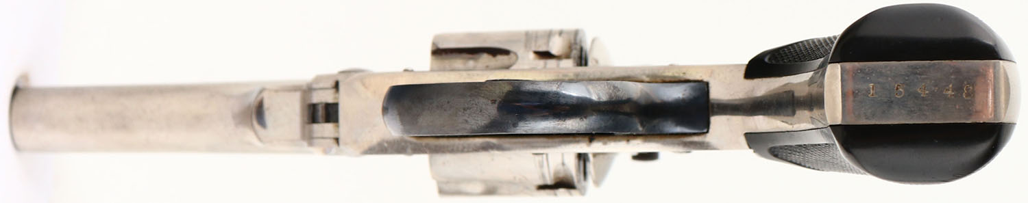 Harrington & Richardson, Double Action Hammerless, CAL: 22RF, MFG: early 1900's, SN: 15448, Double Action Revolver, 3'' barrel. The Target logo checkered hard rubber grips are excellent, with minor wear. The nickel finish rates 90% overall, with thin brush lines, areas of haze light speckling. Bore is excellent, with minor roughness near the muzzle. Notch rear sight & blade front sight. FFL or C&R Req. - Value: 100 to 300