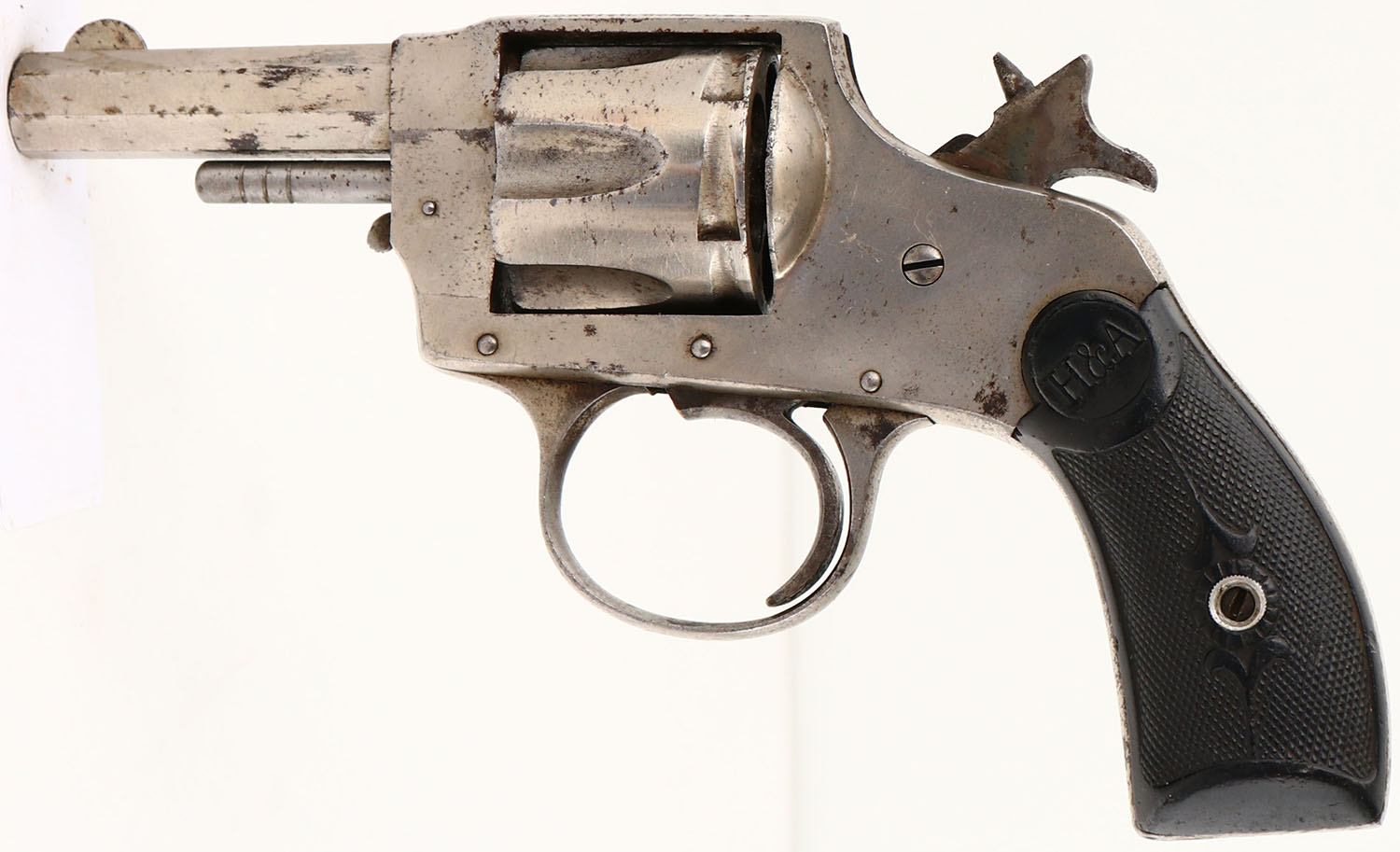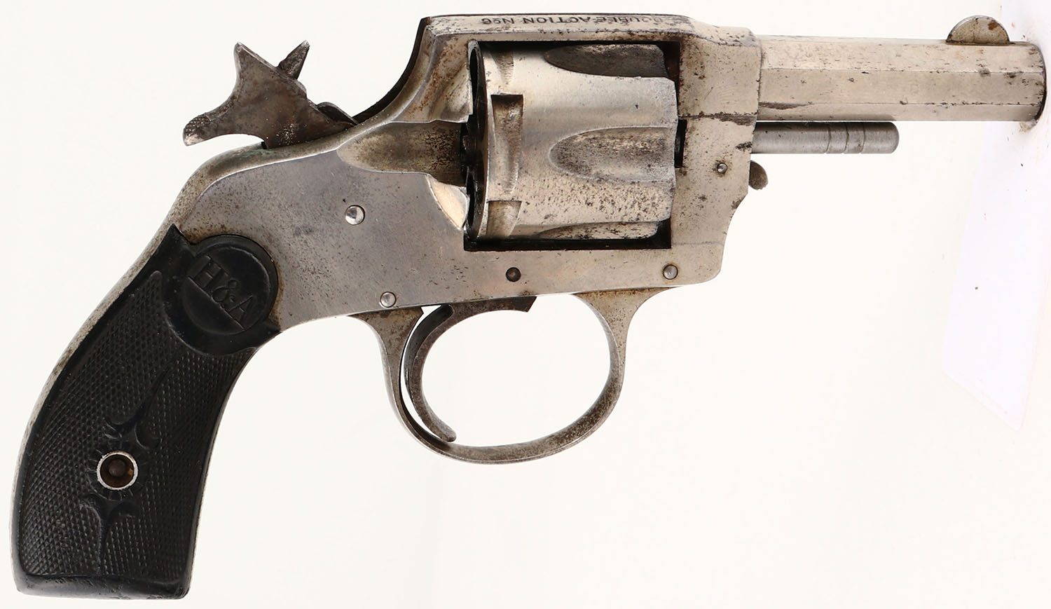 Hopkins & Allen, Double Action No.6, CAL: .32, MFG: circa 1890's, SN: 4737, Double Action Revolver, 2 1/2'' barrel. The H&A checkered hard rubber grips are very good & solid. There are nicks & dings throughout. The nickel finish rates 85% overall, with intermittent spotting/speckling toned to a brown patina. Bore is fair & rough, with no rifling. Notch rear sight & blade front sight. Multiple issues with mechanical operation. Needs to be inspected by a licensed gunsmith before operation. SOLD AS IS- NO RETURNS. Antique, No FFL Req. - Value: 50 to 150
