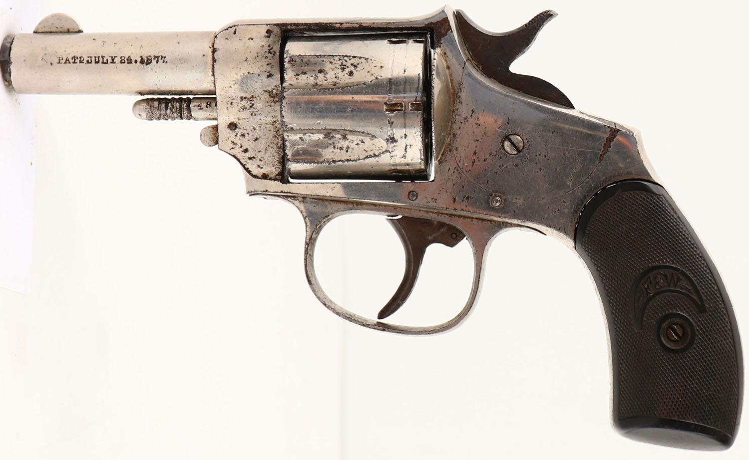 Forehand & Wadsworth, Double Action No. 32, CAL: 32RF, MFG: 1871-1890, SN: 481, Double Action Revolver, 2 1/2'' barrel. The F&W checkered hard rubber grips are excellent. There are minor handling marks throughout. The nickel finish rates 85% overall, with spotting & speckling toned to a brown patina. Bore is fair, dark & rough. Integral notch rear sight & blade front sight. Antique, No FFL Req. - Value: 100 to 200