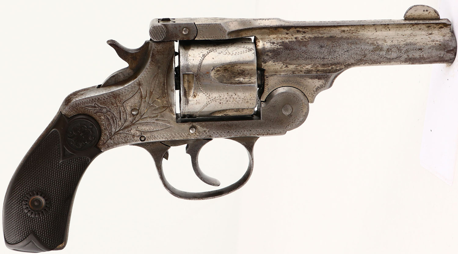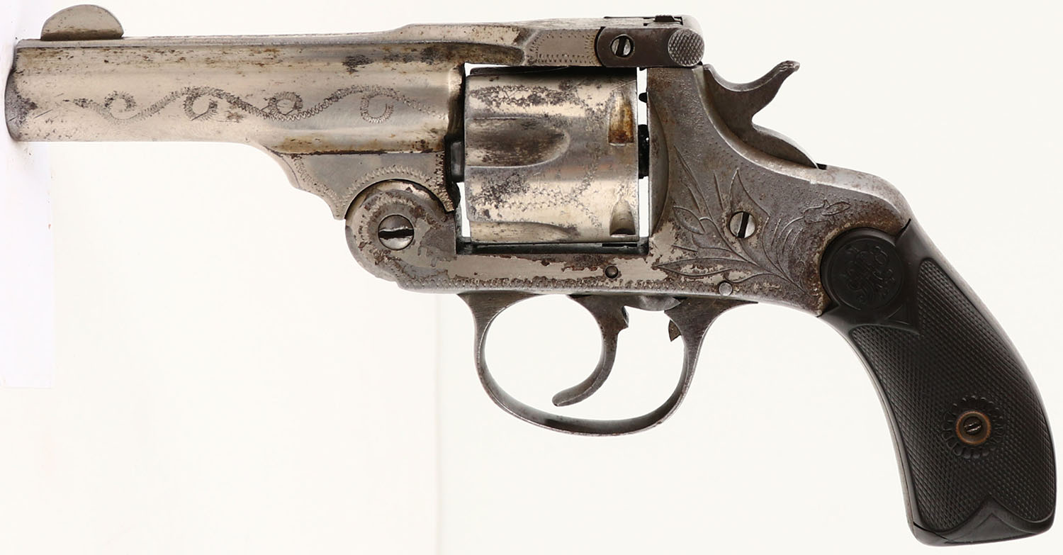 Andrew Fyrberg & Co., Top Break, CAL: 38 S&W, MFG: early 1900's, SN: 9612 (under grips), Double Action Revolver, 3 1/4'' barrel. The AF monogram checkered hard rubber grips are good & solid. The bottom front corner of the left grip has a small crack & the bottom front corner of the right grip has an edge chip, along with other minor handling marks. The frame, cylinder & barrel all display simple floral & decorative engraving. The nickel finish rates 60% on the barrel & 10% on the frame, mostly worn to metal gray, with spotting toned to a brown patina. Bore is good & bright, with roughness & intermittent light pitting. Small serrated rear sight & blade front sight. Internal parts issues. Hammer occasionally does not fall forward when the trigger is pulled. SOLD AS-IS. NO RETURNS FFL or C&R Req. - Value: 40 to 150