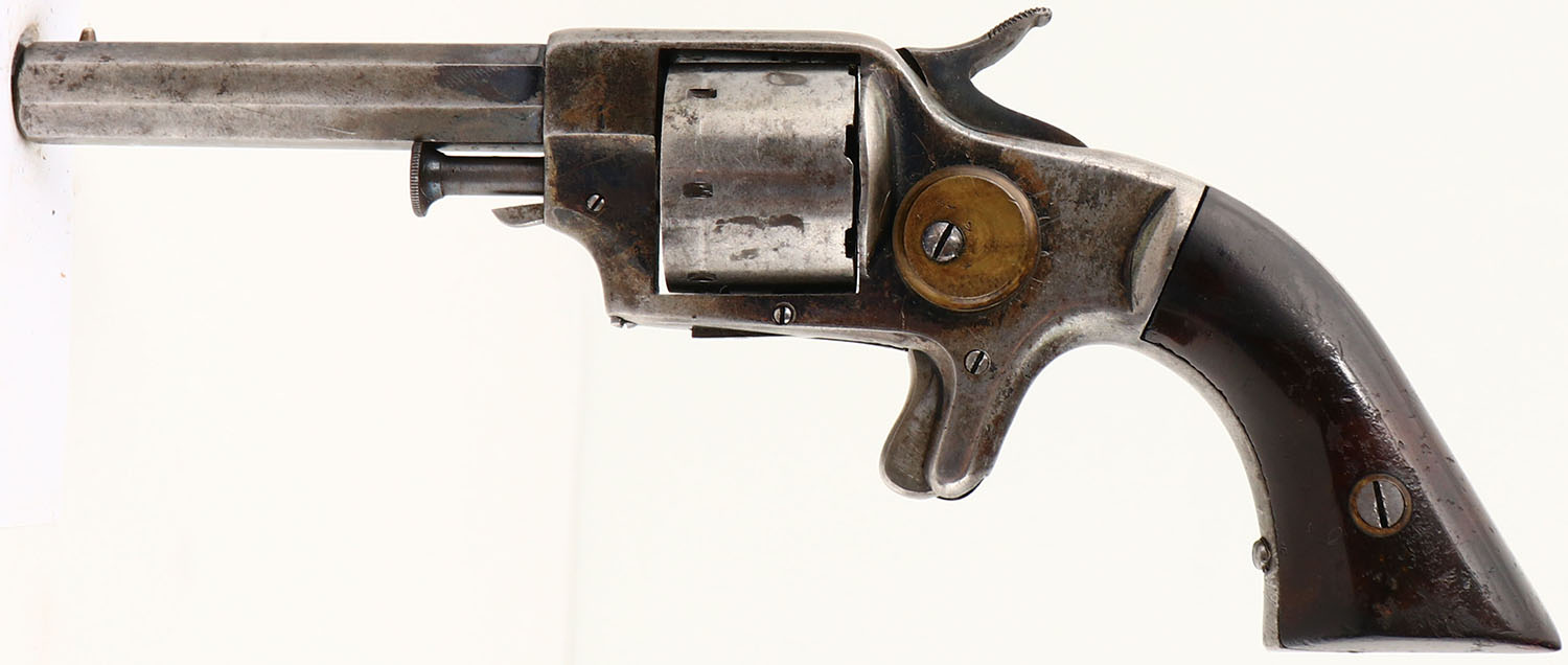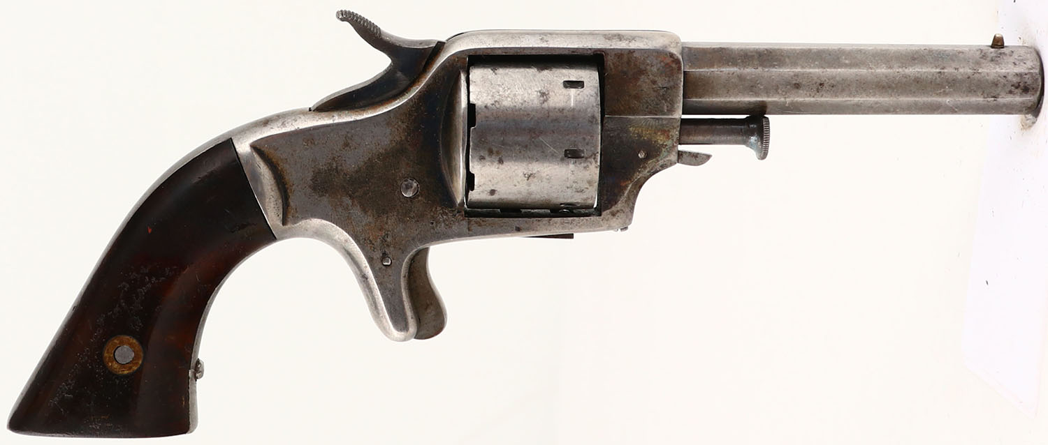 Unknown Maker, Copy of Colt New Line, CAL: 25, MFG: circa 1880's, SN: 571, Single Action Revolver, 2 7/8'' barrel. The two piece wood grips are excellent. There are contusions, light scrapes & areas of flaking finish. The metal blue finish has mostly worn to metal gray & toned to a thin brown patina, with blue remaining in protected areas. Bore is fair, bright, but has pitting throughout. Integral groove rear sight & small brass bead front sight. Antique, No FFL Req. - Value: 100 to 300