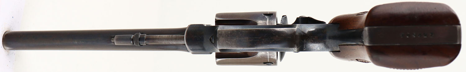 Smith & Wesson, .32-20 Hand Ejector Model of 1905 4th Change, CAL: .32-20, MFG: 1930's, SN: 132504, Double Action Revolver, 6'' barrel, with ventilated rib. The S&W logo medallion checkered wood grips are excellent. There are minor handling marks & a couple dings. The metal blue finish rates 40% on the barrel, 75% on the frame, & the cylinder has toned to a bronze patina, with areas worn to metal gray. The case-hardened trigger & hammer retain visible case-colors. Bore is excellent, but appears frosted or hazy. Replaced square notch rear sight & a ramp elevated blade front sight sits on the ventilated rib. Comes with a Bucheimer leather holster. FFL or C&R Req. - Value: 250 to 450