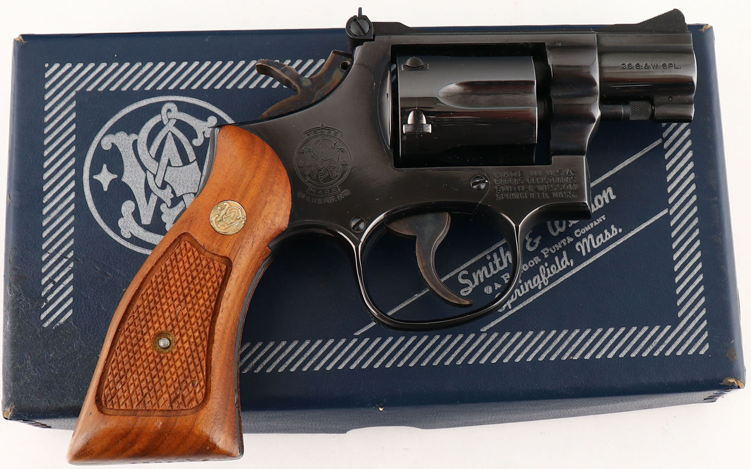 BOXED, Smith & Wesson, Model 15-4, CAL: 38 S&W SPL, MFG: 1978, SN: 33K4894, Double Action Revolver, 2'' barrel. The S&W logo medallion checkered wood grips are excellent. The original metal blue finish rates 99%+ overall. The case-hardened trigger & hammer retain excellent case-colors. Bore is mint. Adjustable rear sight & serrated blade front sight. Comes in SN matching box, with related paperwork, cleaning brush/rod & original packaging. FFL or C&R Req. - Value: 550 to 750