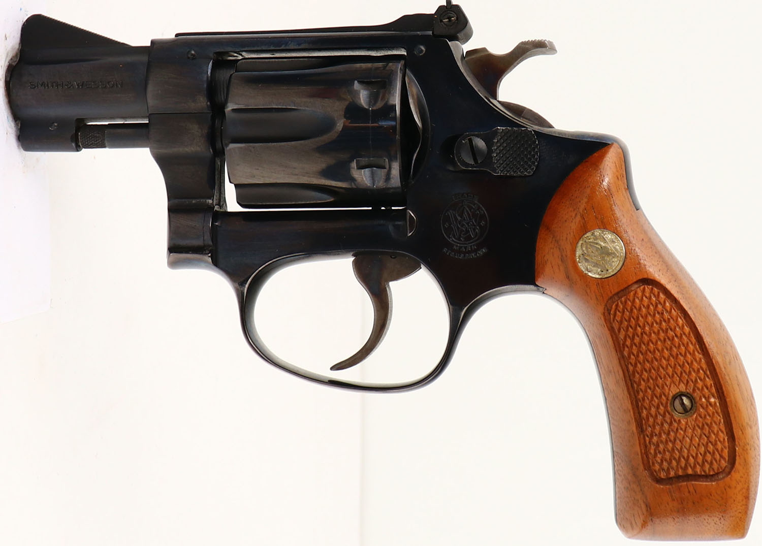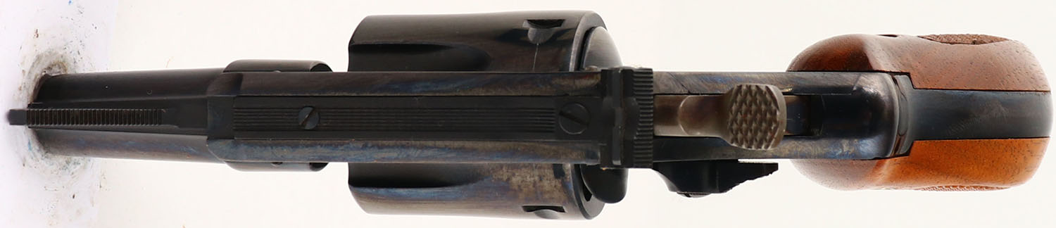 BOXED, Smith & Wesson, Model 34-1, CAL: .22LR, MFG: 1971-73, SN: M50091, Double Action Revolver, 2'' barrel. The S7W logo medallion checkered wood grips are excellent. The original metal blue finish rates 99%+ overall. The case-hardened trigger & hammer retain excellent case-colors. Bore is excellent. Adjustable rear sight & serrated blade front sight. Comes in SN matching box, with related paperwork, cleaning brush/rod & original packaging. FFL or C&R Req. - Value: 600 to 900