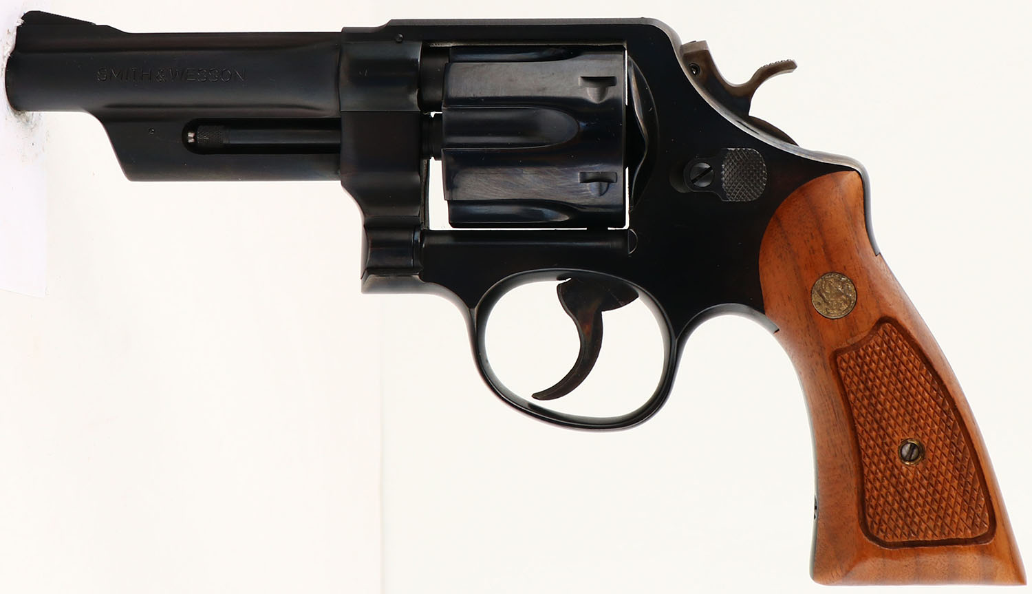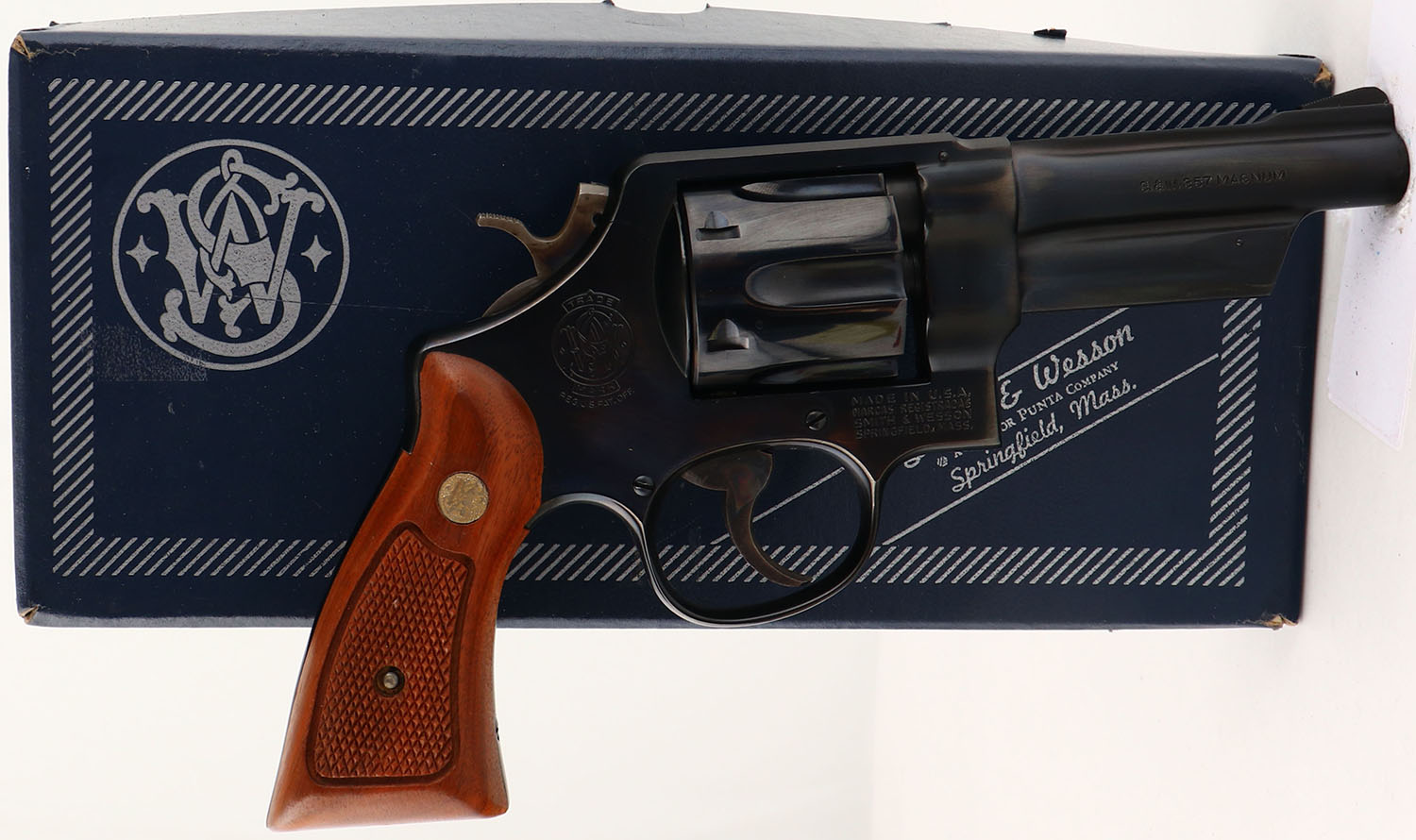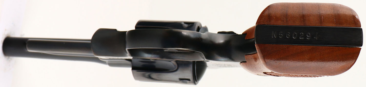 RARE & BOXED, Smith & Wesson, Model 520 ''.357 Magnum Military & Police'', CAL: 357 MAG, MFG: 1980 ONLY, SN: N560294, Double Action Revolver, 4'' barrel. These revolvers were originally ordered for the New York State Police, but never purchased or delivered. It is speculated that the contract was going to take too long to produce, so the NYSP looked into readily available firearms. These guns are usually found in NIB condition, as this example is. The S&W logo medallion checkered wood grips are excellent. The original metal blue finish rates 100% overall. The case-hardened trigger & hammer retain excellent case-colors. Bore is mint. Square notch rear sight & serrated blade front sight. Comes in SN matching box, with related paperwork, cleaning brush/rod & original packaging. FFL Req. - Value: 900 to 1200