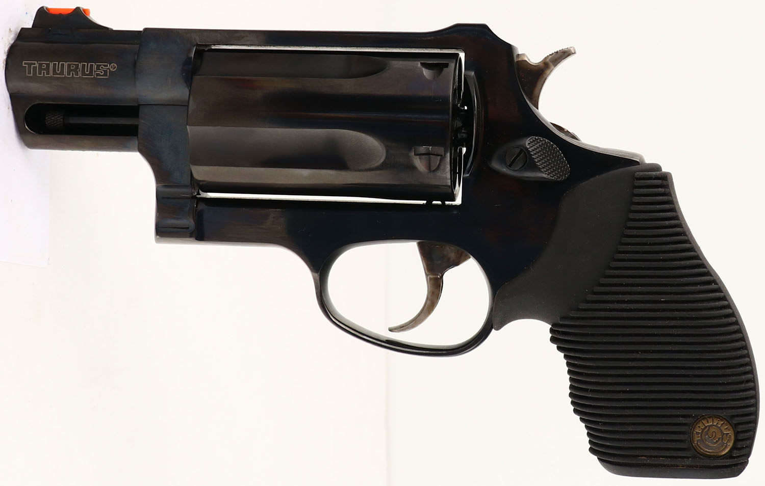 Taurus, The Judge Public Defender, CAL: 45/.410, MFG: Modern, SN: CX946179, Double Action Revolver, 2'' barrel. The Taurus logo medallion grooved rubber grips are excellent. The metal blue finish rates 97% overall. Bore is excellent. Notch rear sight & orange fiber optic front sight. FFL Req. - Value: 300 to 450