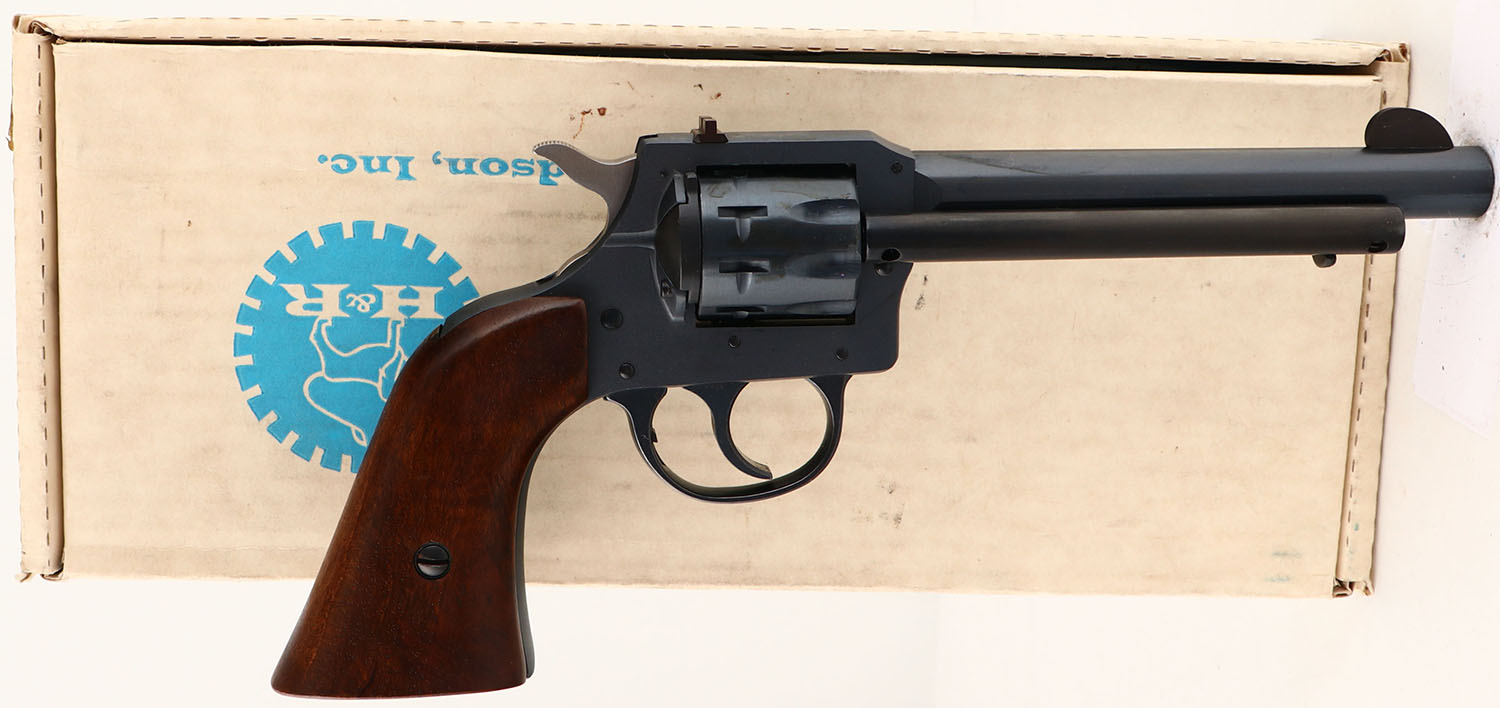 BOXED, Harrington & Richardson, Model 949 ''Forty Niner'' Second Model, CAL: 22, MFG: 1973-86, SN: AN66186, Double Action Revolver, 5 1/2'' barrel. The second model is identical to the first model, except the second model has a safety transfer bar. The wood grips are excellent. The metal blue finish rates 99%+ overall, with factory grease still present in some areas. Bore is mint. Fixed rear sight & large blade front sight. Comes in factory box, with instruction manual & original packaging. FFL Req. - Value: 200 to 300