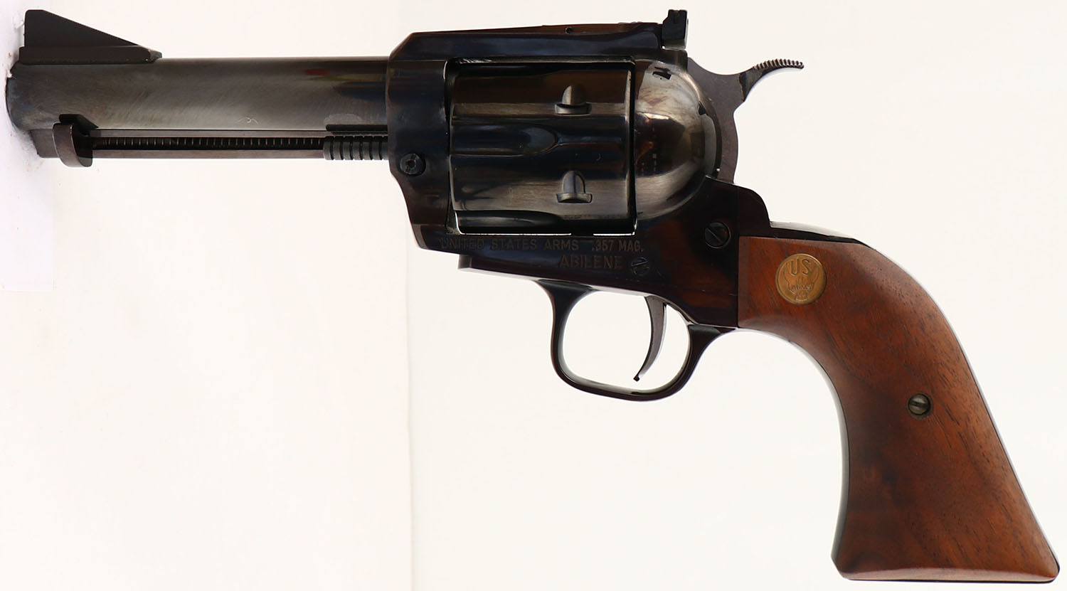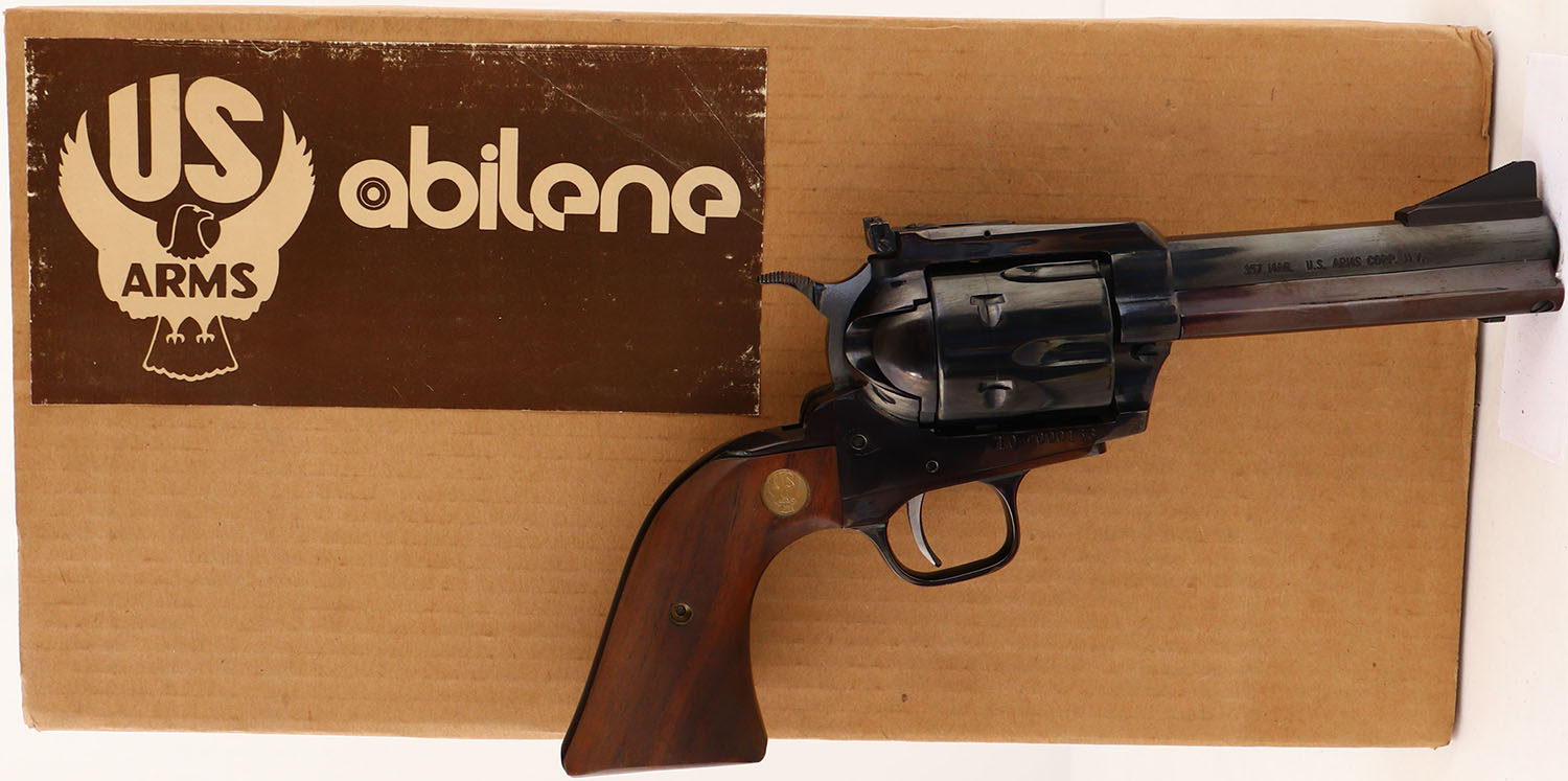 BOXED, United States Arms Co., Abilene (Mod. 104-AB), CAL: 357 MAG, MFG: Modern, SN: 10-000153, Single Action Revolver, 4 1/2'' barrel. The U.S Arms logo medallion wood grips are excellent. The metal blue finish rates 99% overall, with some components beginning to tone plum & areas of haze. Bore is excellent. Adjustable rear sight & serrated blade front sight. Comes in SN matching box with letter from USAC. FFL Req. - Value: 400 to 800