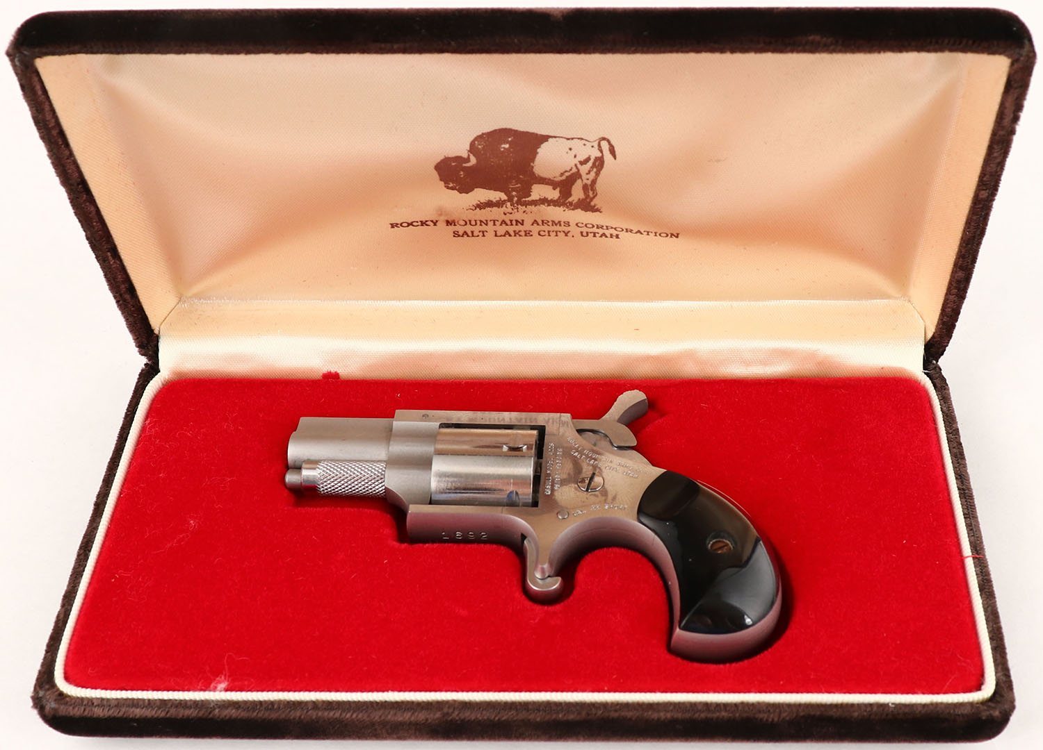CASED, Rocky Mountain Arms Corp., Casull Model A225, CAL: 22 SHORT, MFG: Modern, SN: 1692, Single Action Revolver, 1 1/16'' barrel. The synthetic black grips are excellent. The two-tone stainless steel finish is excellent. Bore is excellent. Integral rear sight. Comes with factory case, outer cardboard sleeve & owners manual. FFL Req. - Value: 100 to 200