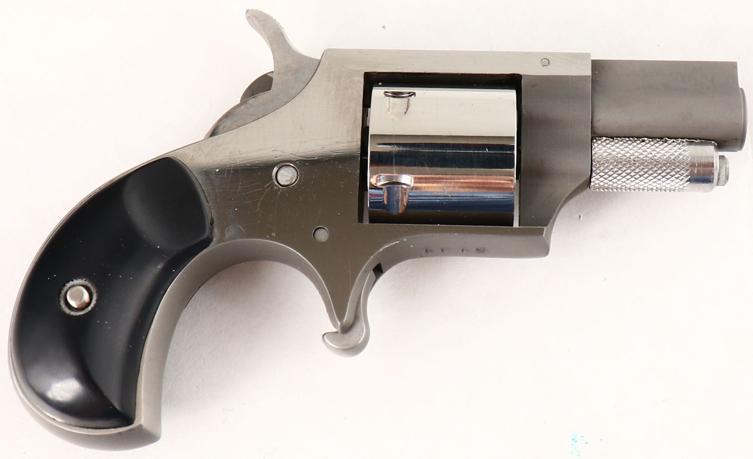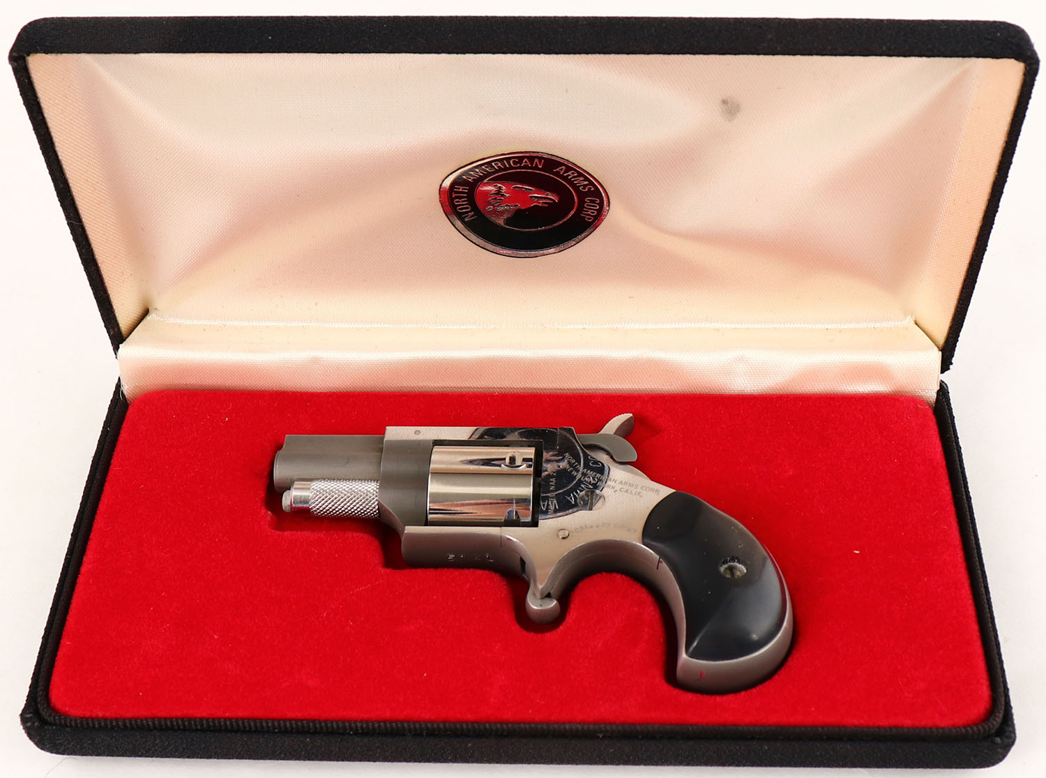BOXED, North American Arms, Model NAA-22-S, CAL: 22 SHORT, MFG: Modern, SN: 5141, Single Action Revolver, 1 1/8'' barrel. The black plastic grips are excellent. The two-tone stainless steel finish is excellent overall, with visible brush lines. Bore is excellent. Integral rear sight. Comes in NAA case, with red interior. Case condition is excellent. FFL Req. - Value: 100 to 200