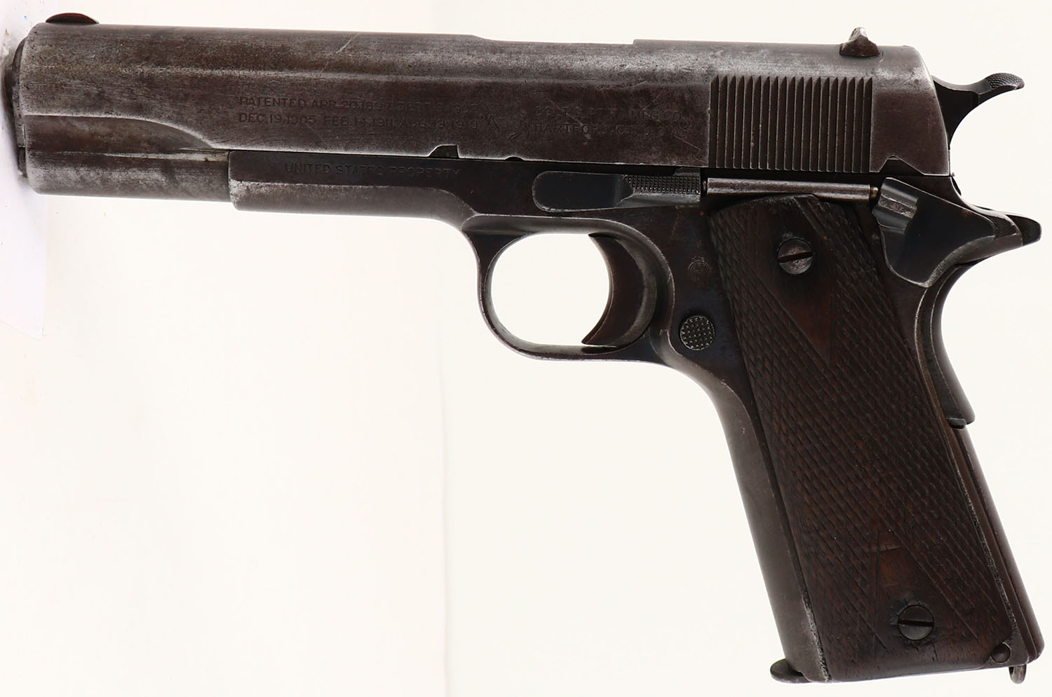 Colt, Model: M1911, Cal: .45 ACP, MFG: 1918, S/N: 223490, semi-auto pistol, 5'' barrel. The checkered, diamond, walnut grips are good. They are structurally fine with no cracks, chips, & one small dings & dents, they just display heavy use wear & the checkering is starting to wear smooth around the edges. The metal on the slide has worn to a gun metal gray, with spots of brown patina & scratches. The metal on the frame has toned to a brown patina with areas of thinned blue & heavy wear spots have worn to a gun metal gray. The left side of the slide is marked with the colt patent dates, a worn rampant colt logo, ''COLT'S PT.F.A.MFG.CO.'', ''HARTFORD.CT.U.S.A.''. The right side of the slide is marked ''MODEL OF 1911.U.S.ARMY''. The left side of the frame is marked ''UNITED STATES PROPERTY''. The left side of the frame by the mag release button is marked with the inspectors mark ''GHS'' in a circle, which is for Major Gilbert H. Stewart. The right side of the frame is marked with the S/N. the top of the barrel is marked ''H'', ''P''. the bore is good. Its bright with roughness & thinned rifling. The slide holds a blade front sight with a V-notch rear sight, part of the right ear of the rear sight is broken off. Pistol comes with one green/gray parkerized WW2 era mag. A well used M1911 that has seen a lot of service. FFL or C&R Req. - Value: 500 to 1000
