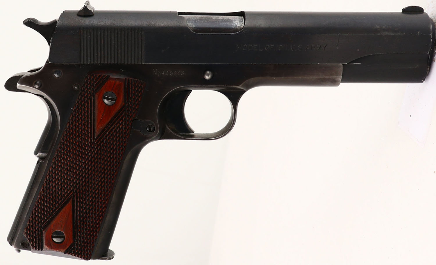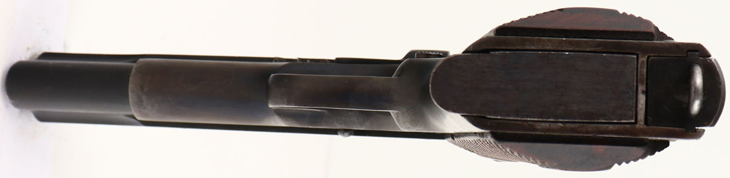 Colt, Model: M1911 U.S. ARMY, Cal: .45 ACP, MFG: 1918, S/N: 428295, Semi-auto pistol, 5'' barrel. The checkered, diamond, walnut grips are excellent ,with light finish wear & some smoothing of the checkering. The metal reblue finish rates 90% on the slide, 80% on the frame, with the frame toning more gray/brown as it thins. The left side of the slide is marked with patent dates, Rampant Colt logo, ''COLT'S PT.F.A.MFG.CO.'', ''HARTFORD.CT.U.S.A.''. The right side of the slide is marked ''MODEL OF 1911.U.S.ARMY''. The left side of the frame is marked with a eagles head over ''S5'', which is a Springfield armory acceptance stamp, & ''14'' on the trigger guard. The right side of the frame is marked with the S/N. The left side of the frame on a 1911 U.S. ARMY, with the eagle ''S5'' stamping, should aslo should be stamped ''UNITED STATES PROPERTY'' on the left side of the frame. While the frame does show some buffing & polishing, including thinning of the eagle ''S5'' stamping in preparation for the reblue, it doesn't appear in our opinion that there was enough buffing to have removed the ''UNITED STATES PROPERTY'' stamping. Removing of U.S. military proof & property stampings is not uncommon on U.S. Military owned guns, as for many decades it was generally illegal for civilians to possess 1911s clearly marked as US government property. After WW2 when the government finally allowed sales of these pistols on the surplus market, it became irrelevant. Some owners or possessors of these guns likely wanted to try & eliminate that trail of ownership or the military's right of retained ownership. It is therefore very likely that this stamping was removed & it was simply done very well or professionally. WWI ended on November 11th 1918, & since this pistol according to SN production records dates to 1918, there is always a small possiblity that this pistol did not receive the ''UNITED STATES PROPERTY'' stamping even though it did receive the eagle ''S5'' stamping that should have been the final military stamping. It remains a mystery to us. The bore is very good & bright, with lightly thinned rifling. The slide holds a blade front sight, with a U-notch rear sight. Pistol comes with one period correct, two-tone Colt mag. This pistol appears to be a commercially sold M1911 U.S. Army, without the correct ''UNITED STATES PROPERTY'' mark of a military used model. FFL or C&R Req. - Value: 800 to 1500