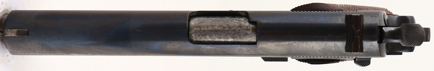 Colt, Model: M1911A1 Government Model, Cal: .45 ACP, MFG: 1932, S/N: C162052, Semi-auto pistol, 5'' barrel. The checkered, diamond grips are excellent. The reblued metal finish on the frame rates90%, while the blue on the slide rates 85%, with spotty thinning & speckling. The darker tone on the front 1/3 of the slide is from that part being hardened to help increase its strength, leading to the metal holding onto the bluing better than the un-hardened section. The left side of the slide is marked ''COLT'S PT.F.A.MFG.CO.HARTFORD.CT.U.S.A.'', & under that is a line of Colt's patent dates. The right side of the slide is marked ''COLT AUTOMATIC CALIBRE .45'' & a rampant Colt logo. The right side of the frame is marked ''GOVERNMENT MODEL'', & the S/N. The left side of the trigger guard is marked with a ''VP'' in a triangle stamp, which is the Colt verified proof factory inspection stamp. The right side of the trigger guard is marked ''60''. The bore is excellent. The slide holds a replaced target sights, which are a taller front sight & a taller square notch rear sight. Pistol comes with one mag marked ''C-R'' on the bottom of the floorplate & ''R'' on the upper part of the floor plate. A very nice example of a pre-WW2 Colt Government Model. FFL or C&R Req. - Value: 1000 to 2000