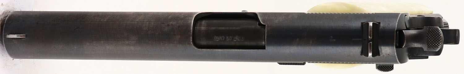 Colt, Model: M1911A1, Cal: .45 ACP, MFG: 1940, S/N: 720501, Semi-auto pistol, 5'' barrel. The replaced, plastic faux-pearl grips are excellent. The blued metal finish on the frame rates 70% with almost full coverage, just areas of thinning. The blued metal finish on the slide rates 75% with almost full coverage just areas of thinning, there is one small spot of cleaned light pitting right next to the rampant colt logo on the left side. The darker tone on the front 1/3 of the slide is from that part being hardened to help increase its strength, leading to the metal holding onto the bluing better than the un-hardened section. The left side of the slide is marked with colts patent dates, the rampant colt logo, & ''COLT'S PT.F.A.MFG.CO.'', ''HARTFORD.CT.U.S.A.''. The right side of the frame is marked ''UNITED STATES PROPERTY'', ''M1911A1 U.S. ARMY'', the S/N, & a ''69'' on the trigger guard. The left side of the frame is marked ''CSR'' by the slide catch, its the inspector stamp for Major Charles S. Reed, who was a Army Ordinance inspector at colt from 1938-40. there is a ''P'' mark by the mag release button which is just a basic proof mark. The left side of the trigger guard is marked with a ''T'', & a ''VP'' in a triangle stamp which is the colt verified proof factory inspection stamp. The top of the barrel is marked ''COLT .45 AUTO''. The bore is very good. Its bright & mirror like with light rifling thinning. The slide holds a wide blade front sight with a U-notch rear sight. Pistol comes with one mag marked ''C-S'' on the bottom of the floorplate & ''S'' on the upper part of the floorplate. A very nice example of a early war colt & one of the last blued M1911's for the military. FFL or C&R Req. - Value: 600 to 1200