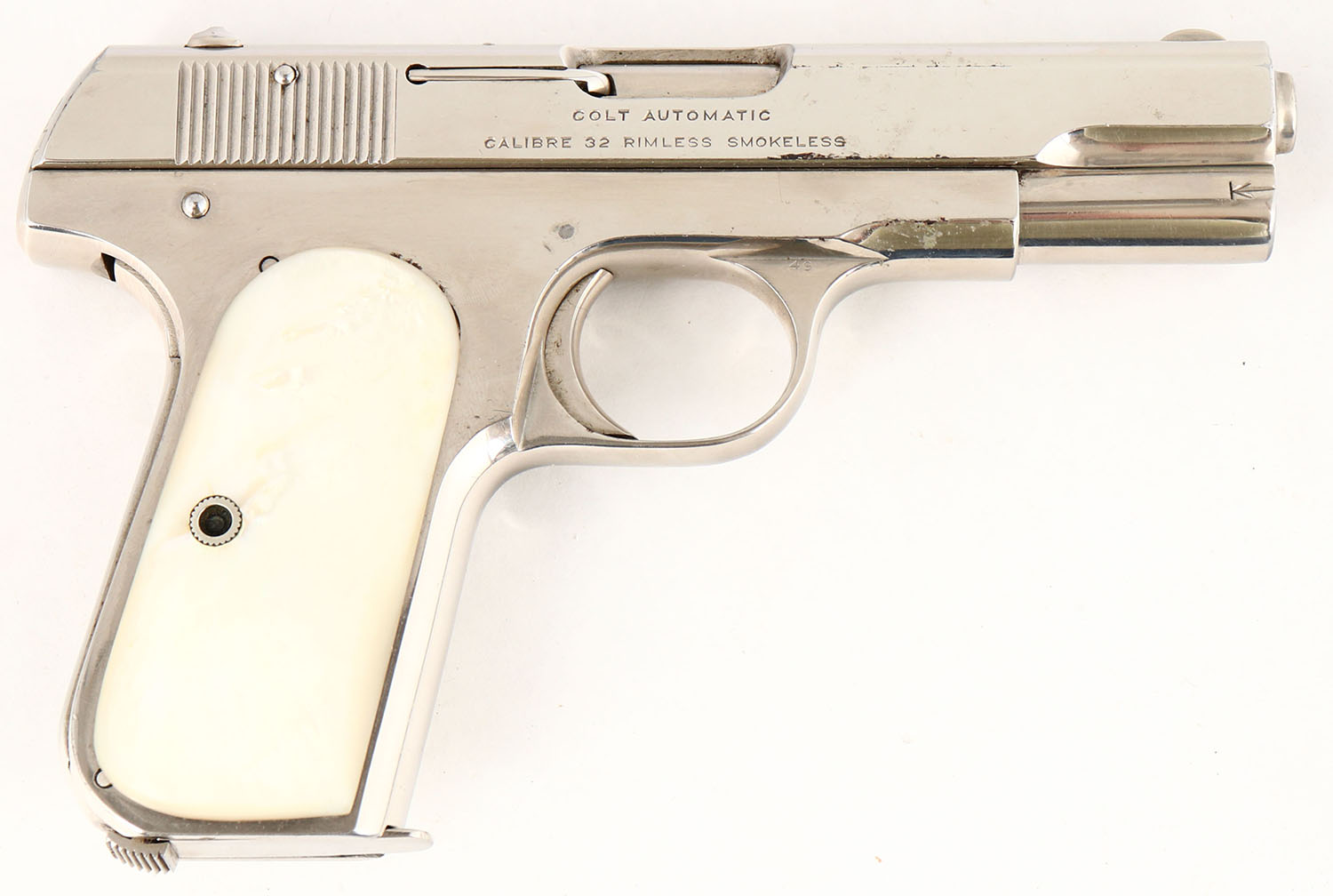 Colt, 1903 Pocket Type III, CAL: .32ACP, MFG: 1919, SN: 312984, Semi Auto Pistol, 3 3/4'' barrel. The Mother of Pearl grips are excellent, with beautiful figure & colors. The nickel finish is excellent, rating 95% overall, with visible brush lines, consistent light spotting on the slide & a small area of flaking on the right side. Bore is good, consistently rough with intermittent light pitting. Rear notch & blade front sight. FFL or C&R Req. - Value: 700 to 1200