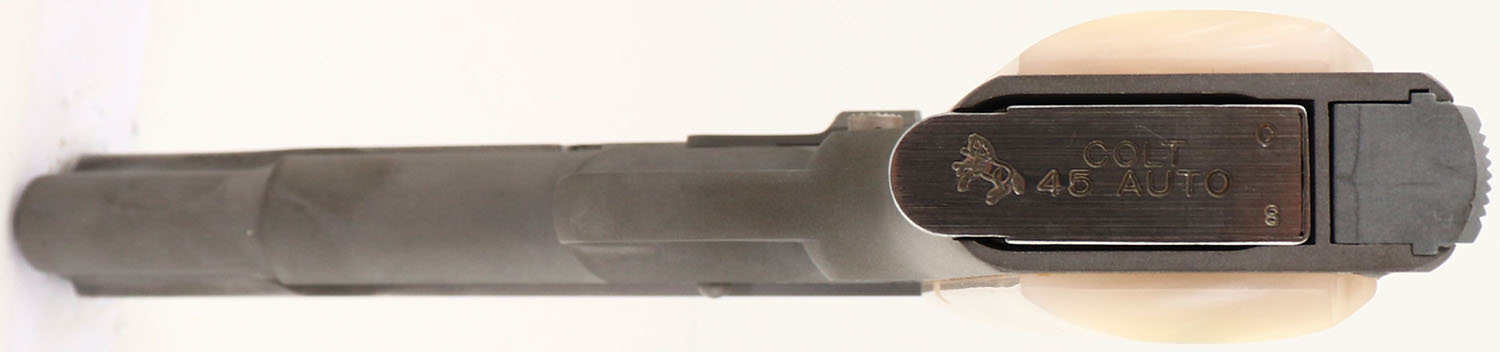 CASED, Colt 1911 Government Model 100 Years of Service Edition, CAL: 45 ACP, MFG: 2011, SN: CV32670, Semi Auto Pistol, 5'' barrel. The Colt logo medallion faux pearl grips are mint. The two-tone matte & polished stainless steel finish are both excellent. The slide has a mirror-like finish. Bore is mint. Factory contrast sights. Comes in factory hard case, with related paperwork, packaging, lock/key. FFL Req. - Value: 1500 to 2000