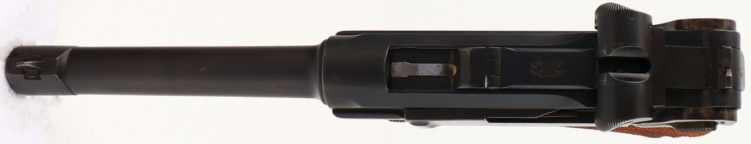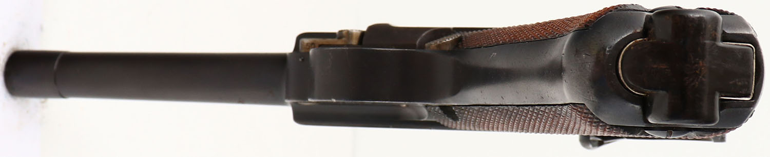 DWM, Model: 1902 Commercial Luger, Old model Short Frame, Cal: 9x19mm Parabellum, MFG: 1902-06, S/N: 4550, Semi-auto pistol, 4 3/4'' barrel. The checkered wood grips are very good with light wear & stains. The metal has been re-blued & as such rates 90% with areas of light wear, rust/patina speckling, & spots of cleaned pitting with blue inside. The left side of the upper assembly is marked with a crown over ''B'', & a crown over ''U'' proofs, both marks are faded from buffing. The top of the toggle is marked with the DWM logo. The front of the frame is marked with the S/N & ''GERMANY''. All visible serialized parts are S/N matching. The bore is excellent. Its bright & mirror like with almost no visible wear. The barrel holds a small barleycorn front sight with wide V-notch rear sight. Pistol comes with one black Bakelite/plastic base mag. Pistol is missing the toggle link pin that connects the toggle to the breech block, & is being sold AS IS with NO RETURNS ACCEPTED (UPDATED 8/28/2024- a replacement pin has been put into the pistol to restore full functionality, still being sold with no returns accepted). A very unique & hard to find model of luger. FFL or C&R Req. - Value: 600 to 1200