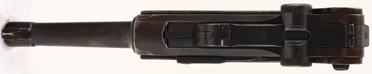 DWM, Model: 1920 Commercial Luger, Cal: 7.65x21mm Parabellum, MFG: 1920-22, S/N: 9715, semi-auto pistol, 3 3/4'' barrel. The checkered wood grips are very good with light scuffs, wear, & stains. The metal finish appears to have been re-blued a long time ago with areas of more wear & brown patina setting in & proof marked faded. as such the finish rates 70% overall. The left side of the upper assembly is marked with one crown over ''N'' proof mark. The front of the frame is marked with the S/N, & the S/N block letter ''P''. The bottom of the barrel is marked with a crown over ''N'' proof mark, the S/N, & the S/N block letter ''P''. The top of the toggle is marked with there DWM logo. All visible serialized parts appear to be S/N matched. The bore is good. Its bright with even roughness throughout & thinned rifling. The barrel holds a barleycorn front sight with a V-notch rear sight. Pistol comes with one wood base mag. FFL or C&R Req. - Value: 500 to 1000